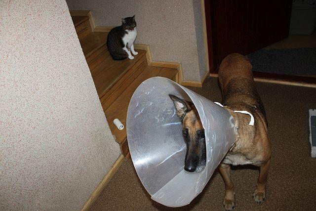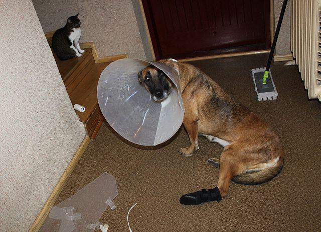 Ona była zdezorientowana i trochę wystraszona, bo z wieczornego spaceru wprowadziliśmy ją do domu, żeby wszystko ogarnąć i chciałam Wam zrobić fotki tego kołnierza... Udręczona nie jest, tylko jej kazałam chwilę się nie ruszać, żeby zrobić fotkę z kotem:) Wstawiam fotkę z chwili później:) Kołnierz jest akurat: 30 cm, sięga w nim do misek (wody i jedzenia) - próbowaliśmy na początku mniejszego 25 cm, to niestety sięgała w nim do buta... czasem się zastanawiam czy i w tym większym nie sięga... Dla żadnego psa kołnierz nie jest fajny i dla nas to też kłopotliwe, ale ja nie mam innego pomysłu jak ochraniać jej łapkę przed obcieraniem. Taki system ustaliliśmy z wetem (duży kołnierz + but). Na początku myślałam o specjalnym bandażu nasączonym preparatem, który zniechęca do lizania/zdzierania, ale wet odradził. Dzisiaj rano znów wszystko było zdjęte... ale kołnierz jeszcze cały, tylko dwa zaczepy zjedzone... but zdjęty, ale cały. Łapka nie była w ogóle zdarta, więc albo sunia zdjęła oprzyrządowanie nad ranem tuż przed tym jak do niej przyszłam, albo... mniej obciera łapkę? więcej jej używa? Wczoraj wieczorem też stan łapki mnie pozytywnie zaskoczył, że nie było świeżego krwawienia. -