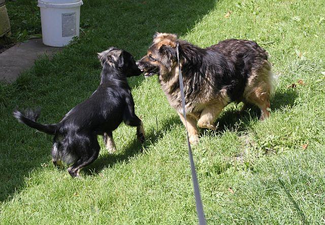 Proponowałam pani, żeby kotkę przetrzymać w domu, ale nie ma takiej opcji, bo kicia strasznie miałczy, kiedy chce wyjść z domu (jest wychodząca) i oni tego nie zniosą... Kotka wcześniej mieszkała z psem i było wszystko ok, dlatego pani nie spodziewała się, że kicia tak się wystraszy. Irysek nie zrobi kotu krzywdy, na początku było wszystko ok, ale kicia w pewnym momencie zaczęła interesować się zawartością miski Iryska i ten tego nie zdzierżył, odgonił ją. I kotka się wystraszyła. -