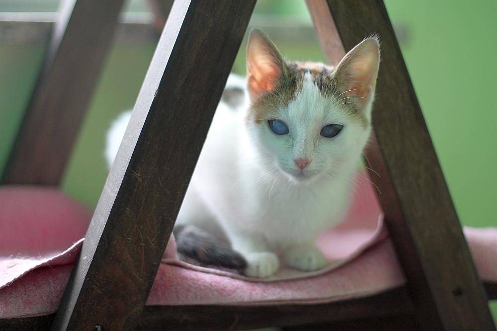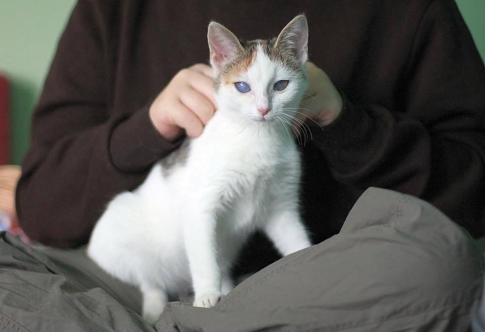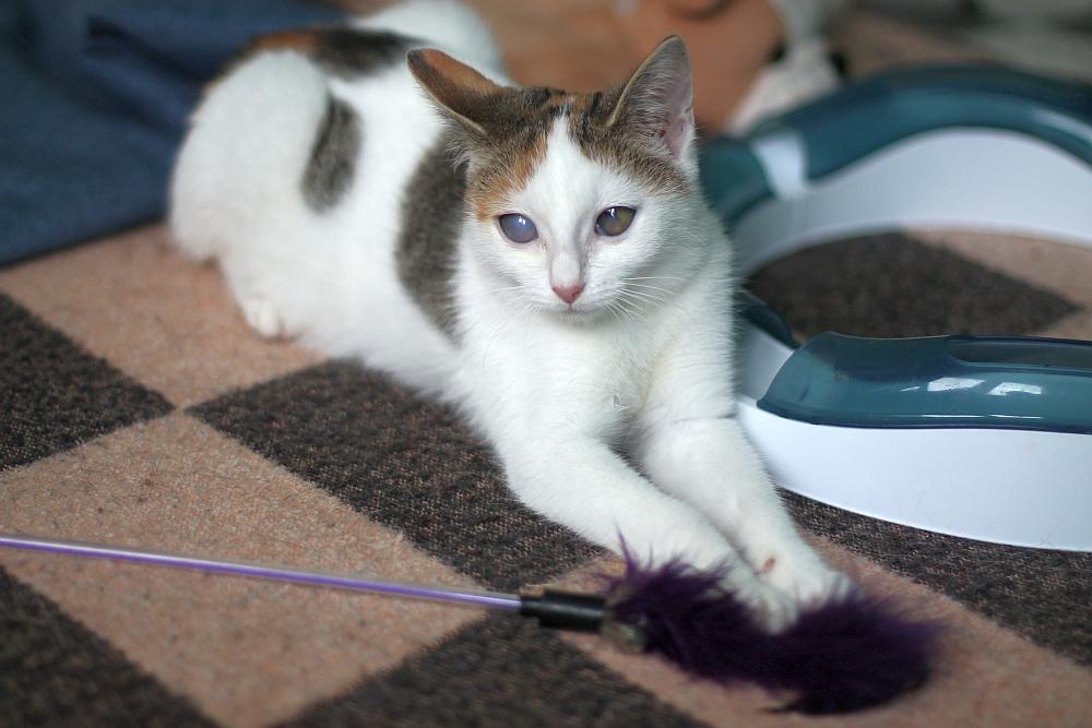 Malinka - aktualne zdjęcia. Kicia jest bardzo przymilna, mrucząca, wielka pieszczocha, jest zabawowa (zwłaszcza lubi zabawki wydające dźwięk). Prócz oczek ma też jakąś wadę tylnich łapek, są sprawne, ale stawia je na iksa. Chciałam to jakoś zobrazować na zdjęciach, ale średnio to wyszło, tutaj na przypadkowym zdjęciu trochę widać (Malinka to ta jedząca oczywiście):