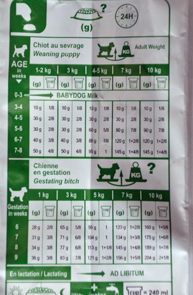 Karmę Royal kupiłam bo podobno taką była karmiona, jednak myślę że nie koniecznie to jadła skoro Pani od której ją mam nie ma pojęcia o zaleceniach producenta... ale zostawmy to. Czytając uważnie zalecenia, doszłam do wniosku że to nie jest odpowiednia karma ponieważ jest przeznaczona na czas odsadzania od matki, czyli jak maluch zaczyna jeść karmę ale jednocześnie ssie jeszcze matkę, i jest przeznaczona do 2 miesiąca życia. Zdaję sobie sprawę że suche chrupki pęcznieją w brzuszku. Dodam tylko że jak dostała na śniadanie łyżeczkę 11g.(mam wagę kuchenną bardzo dokładną) to po zjedzeniu nie miała ochoty na zabawę tylko poszła do swojego legowiska i leżała patrząc na mnie smutnym wzrokiem... czekając na jeszcze