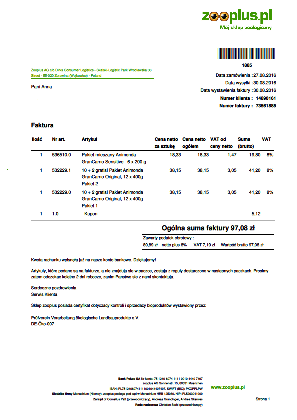 9. Wklejam kolejną fakturę za karmę. Jeśli Tyś uda się wejść na dogo to potwierdzi przesyłkę.