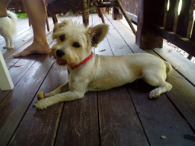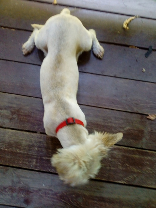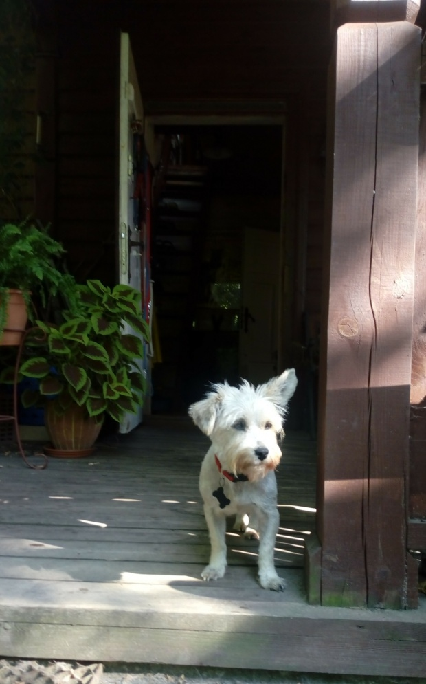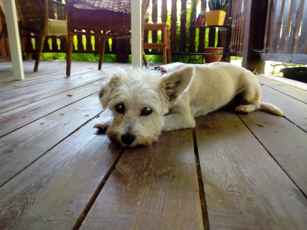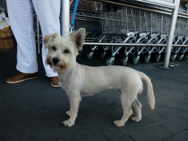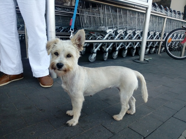 Fryga z westa ma szorstkawą sierść. Po ogoleniu pewnie zjaśnieje.Jedno uszko stoi, drugie jest klapnięte. Dziś już lepiej. Jest bardziej śmiała i ładnie, choć na raty, zjadła śniadanie (gotowane). Chrupek po południu już nie chciała. -