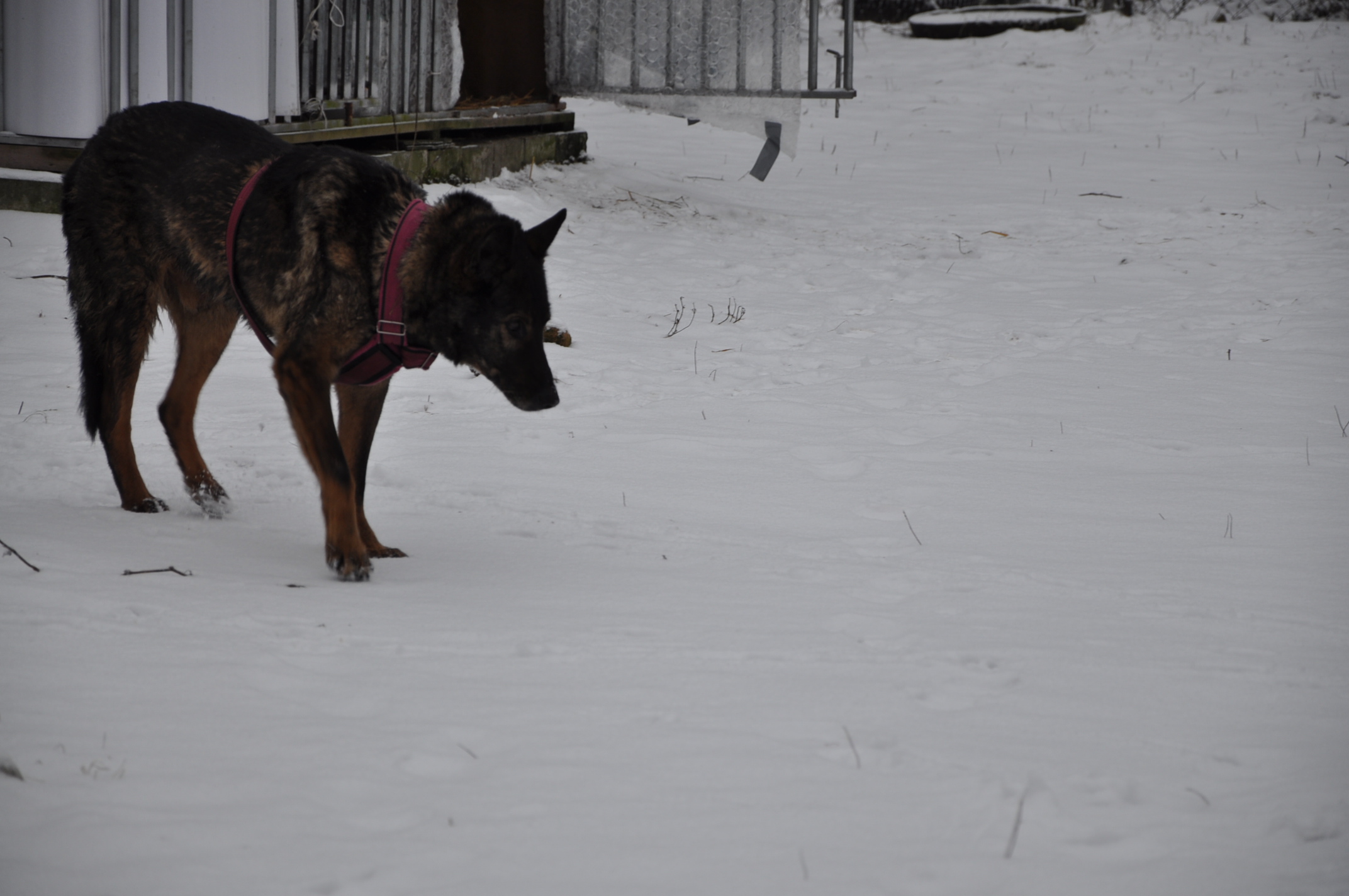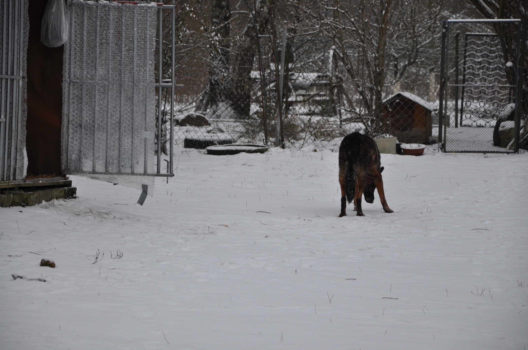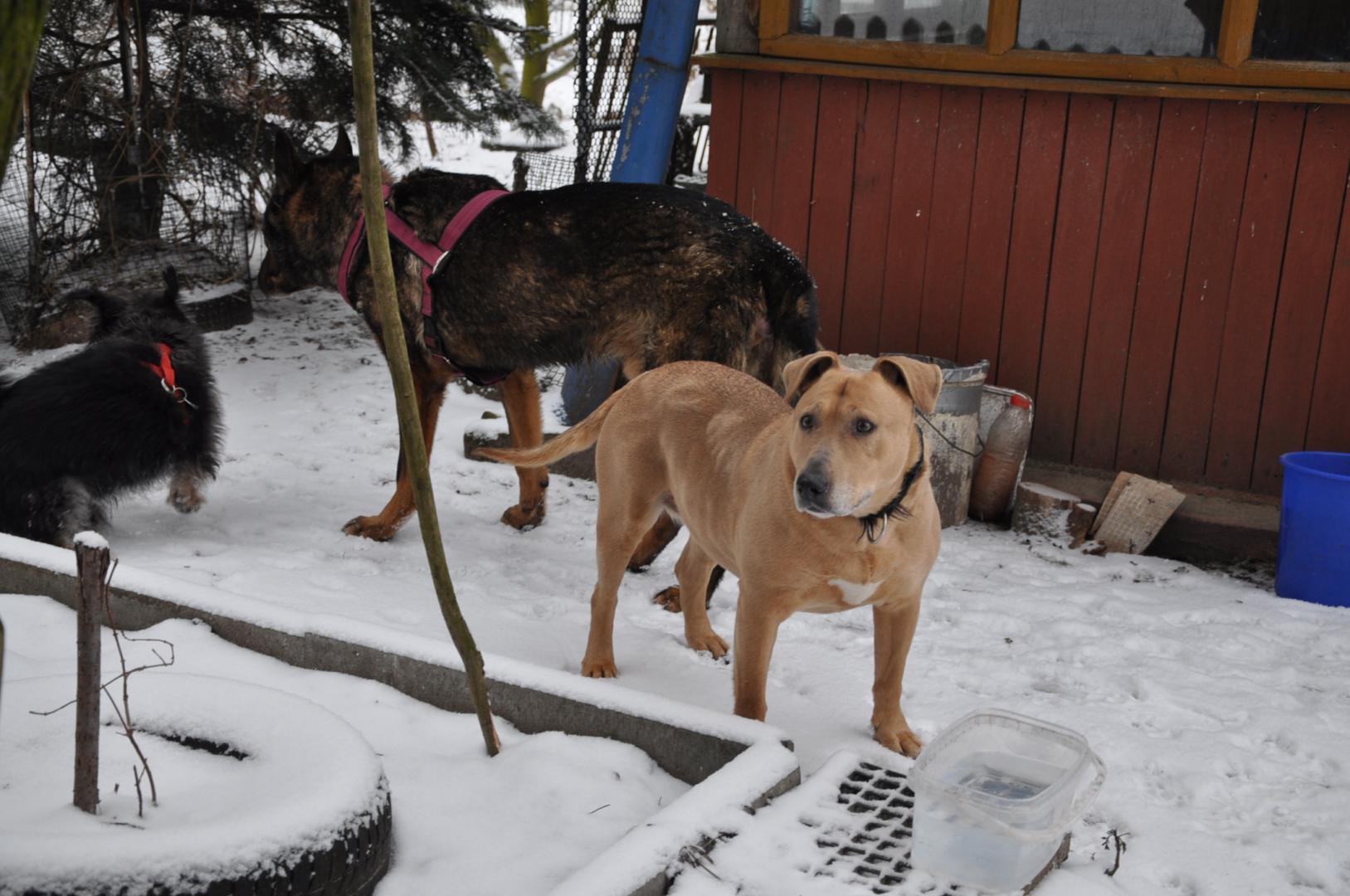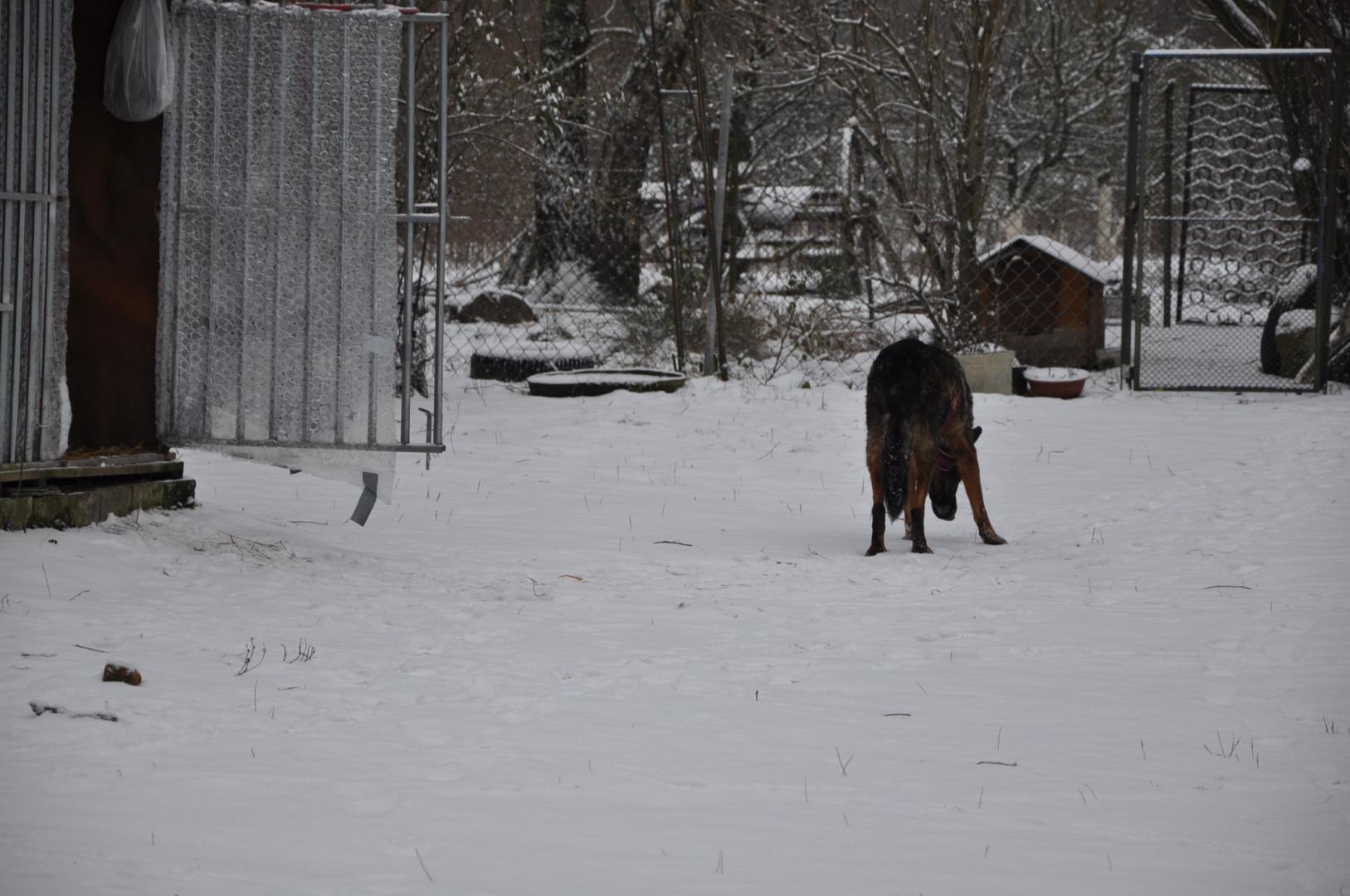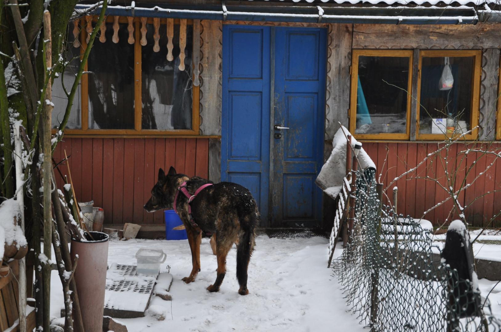 Jestem z wielkimi zaległościami w informacjami, ale nie daję rady. Winę za wszystko ponosi SKS (jeżeli wiecie co to znaczy). Stary komputer do którego byłam przyzwyczajona padł. Nowy to dla mnie wielka zagadka, droga przez mękę i stres. Zrobiłam zdjęcia Borysowi i innym. Problemy: jak je zgrać na komputer, jak je przejrzeć i jak tu wkleić. Ile czasu minie zanim ja się tu odnajdę. Nawet na konto nie zaglądam. Tam też wiele się zmieniło. Trudno skopiować wpłaty. Napracowałam się i zapisać nie mogłam. Wszystko uciekło. Nadrobię zaległości, ale proszę o multum cierpliwości i zrozumienie. Co słychać u Borysa Nie jest dobrze (współczuję mężowi, który sam się tam z tym boryka) Sterydy się skończyły i poprawy nie widać. Borys sam nie wstanie. Trzeba go podnosić a my mamy już pewne lata i własne spore ograniczenia zdrowotne. Do tego to zimno. Tam u nas na działce temperatura taka jak w Suwałkach. Domu Borys panicznie się boi ( u nas leży tam glazura i jemu się nogi rozjeżdżają ) Jest więc w boksie . Na zdjęciu widać jak boks jest osłonięty i zabezpieczony przed zimnem. Do tego mąż mu nosi i wstawia do budy baniaki z mocno gorącą woda nawet w nocy. W budzie ma dużo słomy owsianej i na noc jest jeszcze okrywany. Ostatnio konsultowaliśmy z dr. Kraszewskim (mężem dr. Kraszewskiej z VetCardi, która ratowała naszą Mimi sprawę guza Borysa) Jak pisałam guz jest przy odbycie wielkości jądra i nie można go operować bo uszkodzi się odbyt i nie będzie kontrolował wydalania. Dostał więc Borys tabletki (lek onkologiczny), które mają zmniejszyć tego guza. -