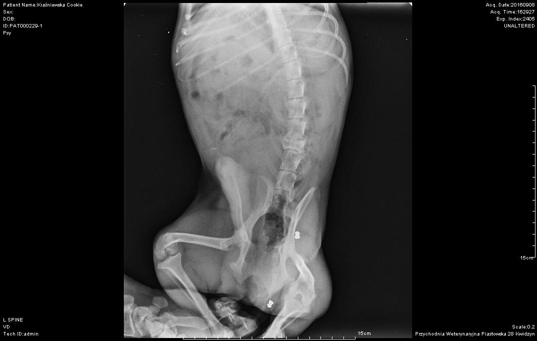 Witam Was serdecznie, faktycznie wprowadziłam tu trochę chaosu. Pisałam tego posta do neurologa i z tego wszystkiego nie zmieniłam treści. Więc po krótce jeszcze raz. Pies ze schroniska ( okaz zdrowia). Jest u nas dwa tygodnie. Po około trzech dniach zaczęliśmy szukać przyczyny niekontrolowanego zachowania - zaniepoloiło nas robienie kupki - pod siebie na legowisku. Okazało się najpierw że Cookie ma ostre zapalenie układu moczowego. Ale zaczęłam szukać dalej i tak zrobiliśmy rtg, które tu załączam. My w okolicy mamy najbliżej dr. Maderskiego w Grudziądzu. zapewne konieczne byłoby wykonanie rezonansu lub tomografu, ale finansowa, to ja nigdy nie dam rady. Teraz już leki pochłonęły masę pieniędzy. Zlamanie kompresyjne z uciskiem na rdzeń to poważna sprawa. Obawiam się, że samoistnie to nie wróci do normy, a nie wiem czy da się coś zrobić chirurgicznie. Musielibyśmy udać się na konsultację, ale na to potrzebne są środki, I stąd moje pytanie, czy w takim wypadku taka "przechowalnia"zwierząt powinna poczuwać się do odpowiedzialności i w jakiś sposób pomóc? Czy może istnieją jakieś fundacje, do których mogłabym zwrócić się o pomoc? My jesteśmy z woj. pomorskiego. Może mogłabym prosić Was o jakiekolwiek namiary, z kim mogłabym się skontaktować. Nie ma nawet opcji takiej, żeby go oddać, Cookiemu trzeba pomóc i zrobić wszystko co w naszej mocy. Dziękuję Wam i proszę o pomoc. Wiola PS. Dodam jeszcze za zauważyłam jedna rzecz, jak cookie zaczyna robić kupę to chwilę wcześniej drżą my tylne łapki i ogonek kręci się na wszystkie strony. Wcześniej tego nie było.