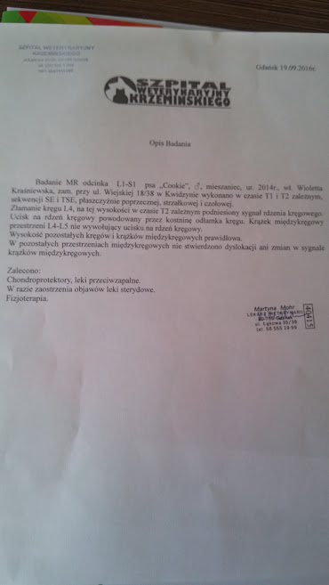 Witamy, Cookie miał wczoraj rezonans magnetyczny, wyniki nie za fajne - wkleję tu opis. Cookie zniósł dzielnie badanie, dostał nowe leki ( 200 złotych) - przeciwzapalne ex-pain, oraz na stawy Synaquin, do tego cały czas nivalin, wit b, antybiotyki, urosept. Piesek ma miec ograniczoną możliwość niegania, skakania, zabawy z psiakami, gdyż paraliż może sie pogłębić. Smutno nam strasznie. Nie pozostaje nam nic innego jak tylko leki doraźne, objawowe i ewentualnie rehabilitacja. Kończą nam się pieniążki na leki i utrzymanie i robi się cięzko Potrzebujemy pieluch, chusteczek, szamponów, kremów....:-( Jeżeli ktoś mógłby pomóc, ta dziś powinno być wydarzenie na SIEPOMAGA oraz wklejam linka do wydarzenia na FB. https://www.facebook.com/events/1820583741510846/