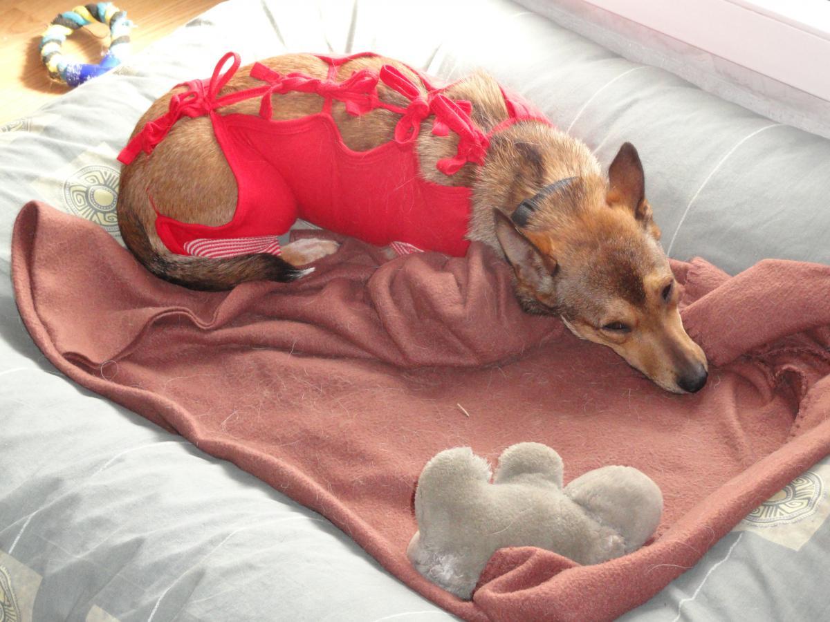 Nie martw się :) Już znalazłam http://www.dogomania.com/forum/topic/29547-kredka/ i idę czytać :) Na zdjęciach - Lerka w przerażającej czerwonej sukience - wkrótce p zabiegu. jak jej sukienke zdejmę, to skacze na dwóch łapkach rzuca sie z dzikim warkotem na pęciny Bliss i odzyskuje radość życia. Jak nałożę - klops :(. Musi jeszcze dotrwać do poniedziałku. Brzuszek ładny, ale sterczą z niego czarne nici. Przerażająca sukienka, nadal niezbędna. Unieruchamia Lerkę. -
