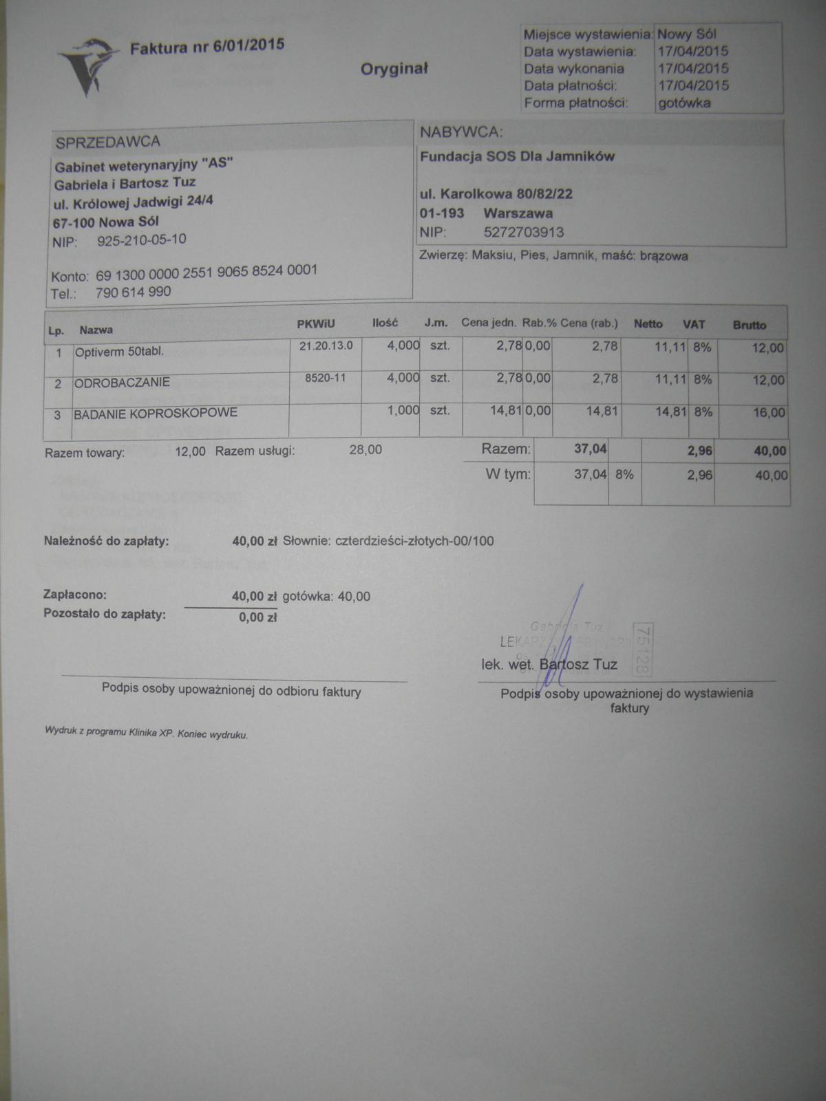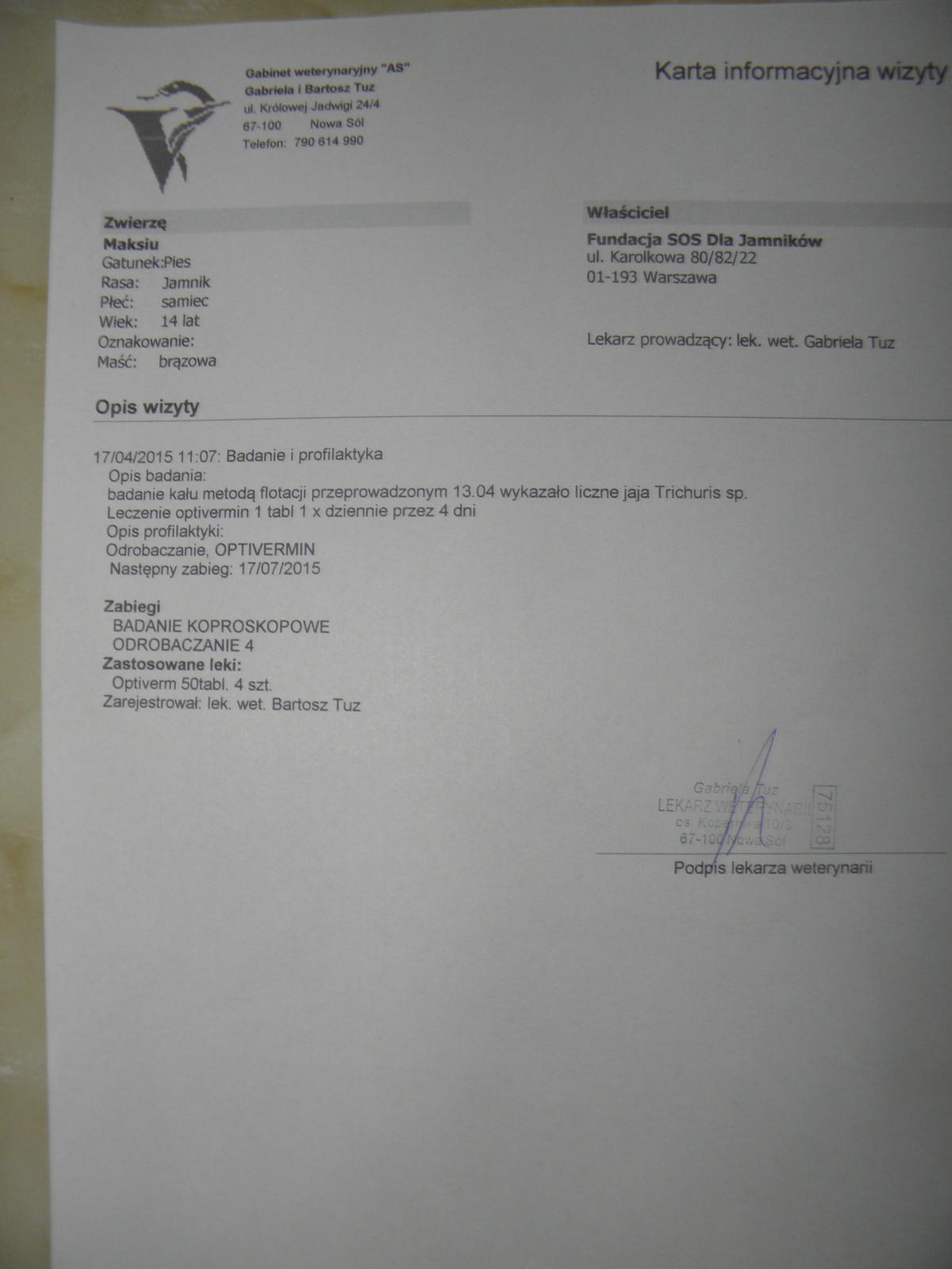 24. Te pasożyty to włosogłówka. Maksiu dostał tabletki i będzie brał po jednej przez 4 dni. Po około miesiącu trzeba będzie zrobić ponownie badania. Do badania dałam tyle kup, ile pisałyście. Maksik dostał próbkę karmy, 4T Veterinary Diet renal dog. Zobaczymy, czy mu zasmakuje. Badanie kału i tabletki kosztowało 40 zł. czy mam wziąć paragon, czy fakturę na fundację?