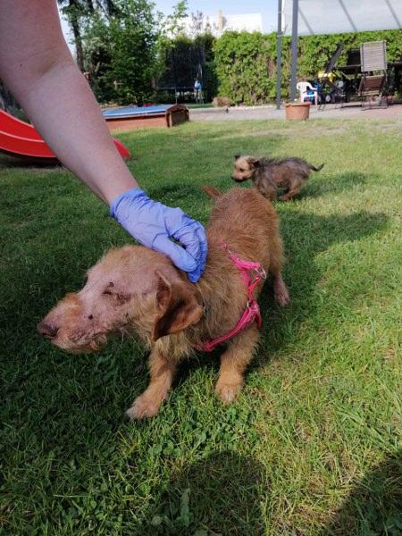 Reszka nie przejawia strachu, wydaje się być wesoła, ufna. Bardzo się cieszy jak nas widzi, jest ciekawska, pozwiedzała ogród, chciałoby się ją wytulić i wycałować. Zrobiła kupę z robakami dzisiaj rano, więc podam Reszce tabletkę na odrobaczenie. Na pyszczku widoczne są pęknięcia skóry, podpytam naszego weta, może można by czymś pryskać, albo smarować, by było tego jak najmniej.