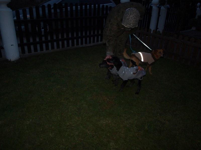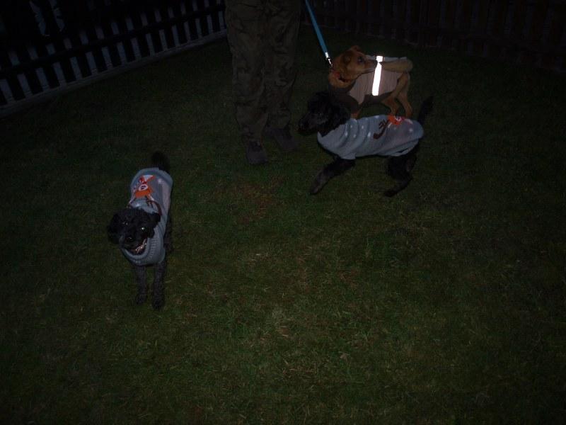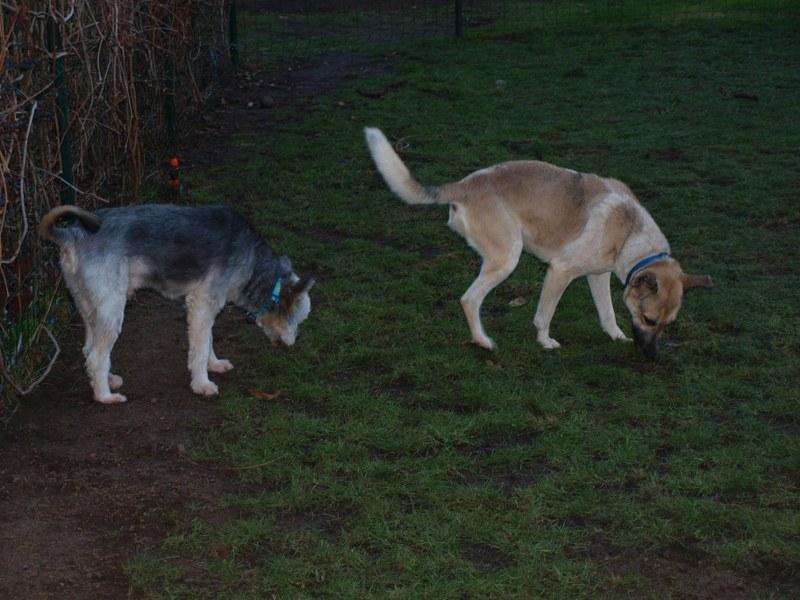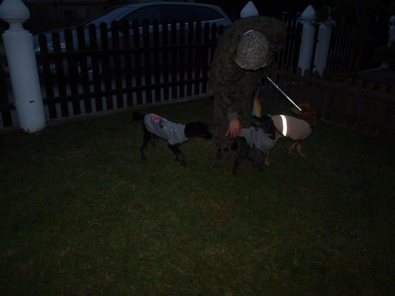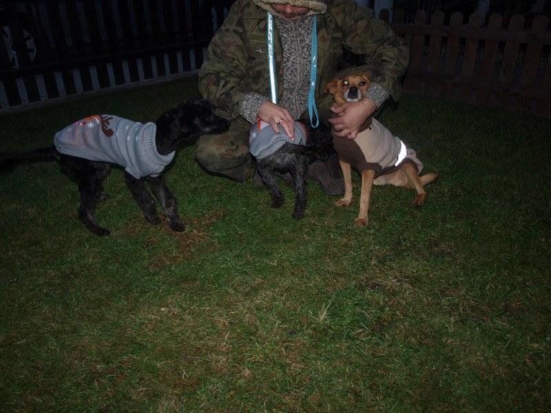 Dziewczyny już po spacerku, obwąchaniu i pierwszych pieszczotach ode mnie. Pierwszą z transportera wzięłam Sarę, co Majce bardzo się nie podobało - bardzo drapała w drzwiczki i szczekała. Sara spokojna, grzecznie szła na smyczy, obwąchała teren, zrobiła siku i kupę, napiła się wody, nie zainteresowała się jedzeniem, położyła się na kocu. Maja szalona, po wyjściu z transportera skakała na mnie bez przerwy, walczyła ze smyczą, robiła piruety, biegała od lewa do prawa, nie załatwiła swoich potrzeb z przejęcia pewnie. W domu rzuciła się na miskę z jedzeniem i schrupała wszystko. Obydwie chudziutkie. Maja wydaje mi się trochę większa od Sary, tzn ma dłuższe łapy, ale jutro poobserwuję je na spokojnie. Od Fundacji ZEA otrzymały szelki i smycze, oraz krople Advocate.