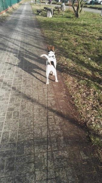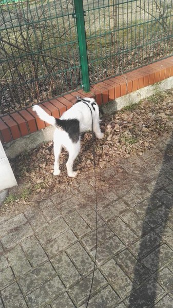 Malwinka przyjechała do nas dzisiaj. Wyszła z auta i stała przy płocie z opuszczonymi uszami i ogonem, a gdy tylko ją zawołałam, to ożyła i przyleciała z radością się przywitać. Otworzyłam drzwi, a Malwina jakby nigdy nic weszła i położyła się w legowisku. Do teraz nic nie zrobiła w domu, było siku na dworze. Może na spacerach była tak skupiona na smyczy, że nie czuła swoich potrzeb. Pani mówi, że ma zasikane dywany, panele i to nie oto chodzi w posiadaniu psa, żeby ciągle po nim sprzątać odchody. Malwina chodziła na spacery na 3 smyczach spiętych ze sobą, tak by miała więcej swobody. Jednak zawsze szła tylko przed siebie, bez przyjemności, tak jakby czekała, kiedy będzie mogła wrócić do mieszkania. Myślę, że Malwinka już jest na tyle otwarta na człowieka, że warto szukać jej domu z ogrodem. Mimo wszystko będę wychodzić z nią również na smyczy.