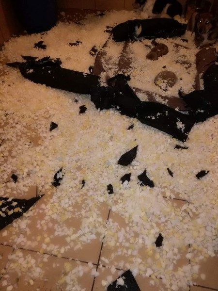 Mika bawi się z psiakami, bawi się zabawkami i w pewnym momencie zaczyna sobie gryźć koc, legowisko... to co jej się napatoczy. Bobika chcieliśmy zważyć na wadze dla ludzi, więc Piotrek brał go na ręce, by z nim wejść na wagę, ale trzaskał psiak zębami i dlatego średnio to wyszło. Jak go głaszczemy to jest OK, ale widocznie nie lubi, albo boi się brania na ręce. Może nie zaufał nam jeszcze na tyle. Zamówiłam 2 worki karmy suchej dla zamojskiej piąteczki i wczoraj przyjechała. Wystawię fakturę na ZEA i jak zawsze podeślę Marcie.