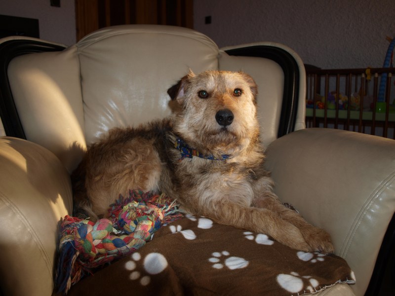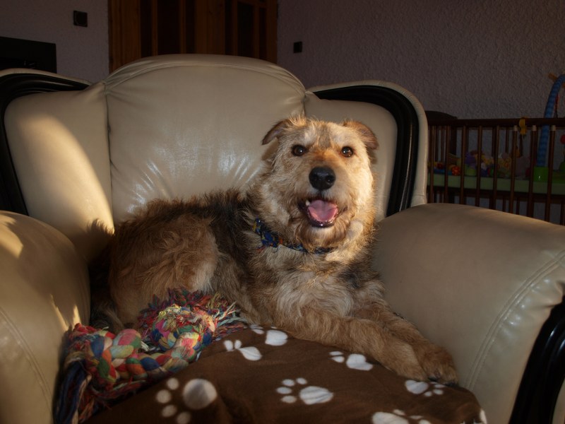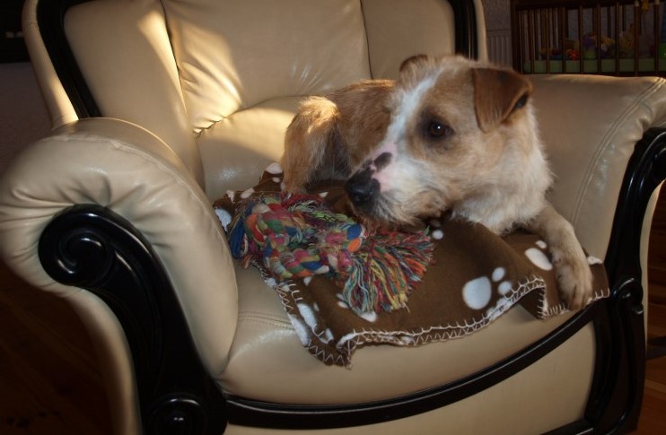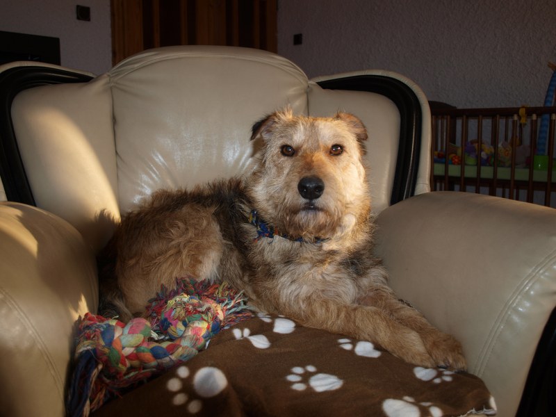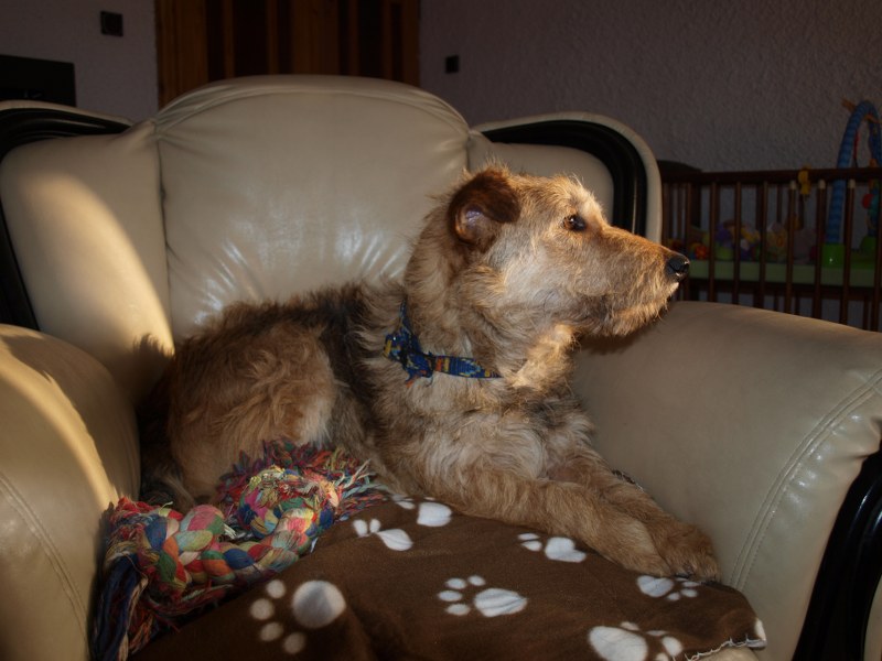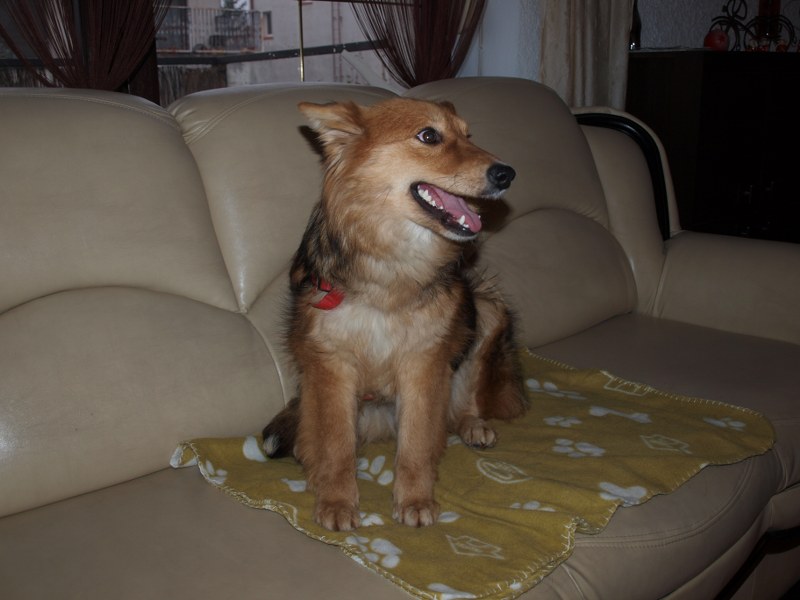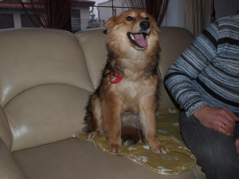 Żaden fotel nie jest tak wygodny jak mój :) ale Fosterkowi będzie wystarczyło, że zamieszka w domu. Może to być dom i blok, ale właściciele aktywni, ponieważ Foster potrzebuje dużo ruchu. Uwielbia biegać, bawić się głównie z człowiekiem. W związku z tym, że Foster skacze, myślę, że nie nadaje się do malutkich dzieci. Kota naszego goni, wśród psów jest dominatorem i potrafi pokazać ząbki, jeśli pójdzie coś nie po jego myśli. Je dużo, jak skończy, to wygania inne psiaki od ich misek, dlatego karmiony jest osobno. Dostaje oczywiście większą porcję jedzonka. Foster jest pieszczochem i myślę, że najszczęśliwszy będzie jako jedynak, który chodzi często na spacery lub ma do dyspozycji ogród. To chyba tyle, odpowiem na pytania, jeśli o czymś zapomniałam wspomnieć. Fundacja ZEA sfinansowała 20 kg suchej karmy, która smakuje Fosterkowi.