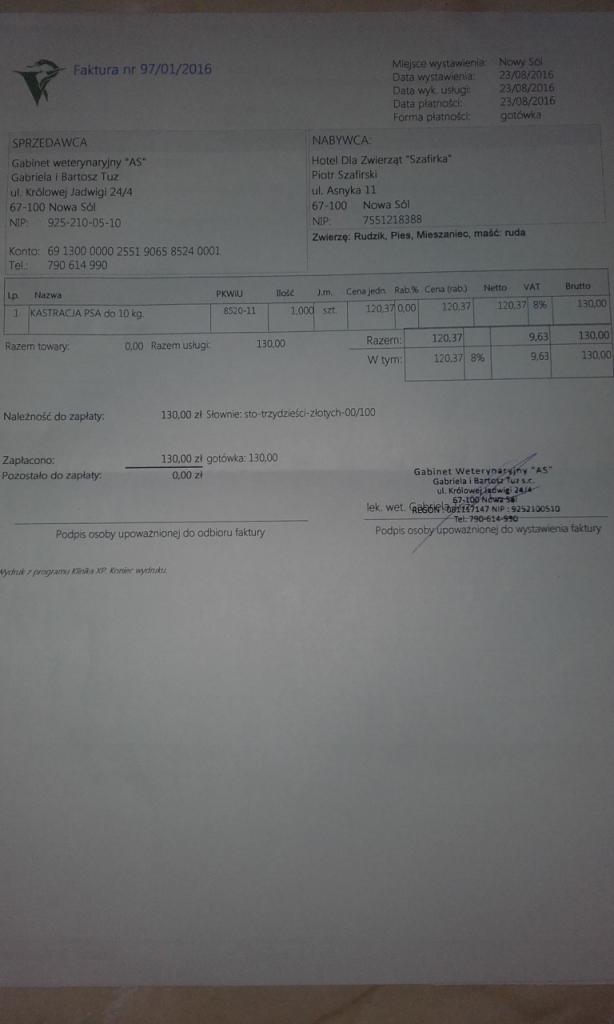 Ja raczej nie będę się z Panią widzieć, ale mój TZ zawsze stałe informacje przekazuje, bez względu na to, czy zostały powiedziane, czy nie. Przechadzaliśmy się z Rudzikiem na krótkie spacerki na smyczy, ale teraz trwa przerwa ze względu na kołnierz założony po kastracji. Mam nadzieję, że przyzwyczai się szybciutko do smyczy i będzie mógł towarzyszyć swojej Pani w spacerach. Faktura za kastrację oczywiście jest, rano pisałam z innego komputera i nie mogłam jej załączyć.