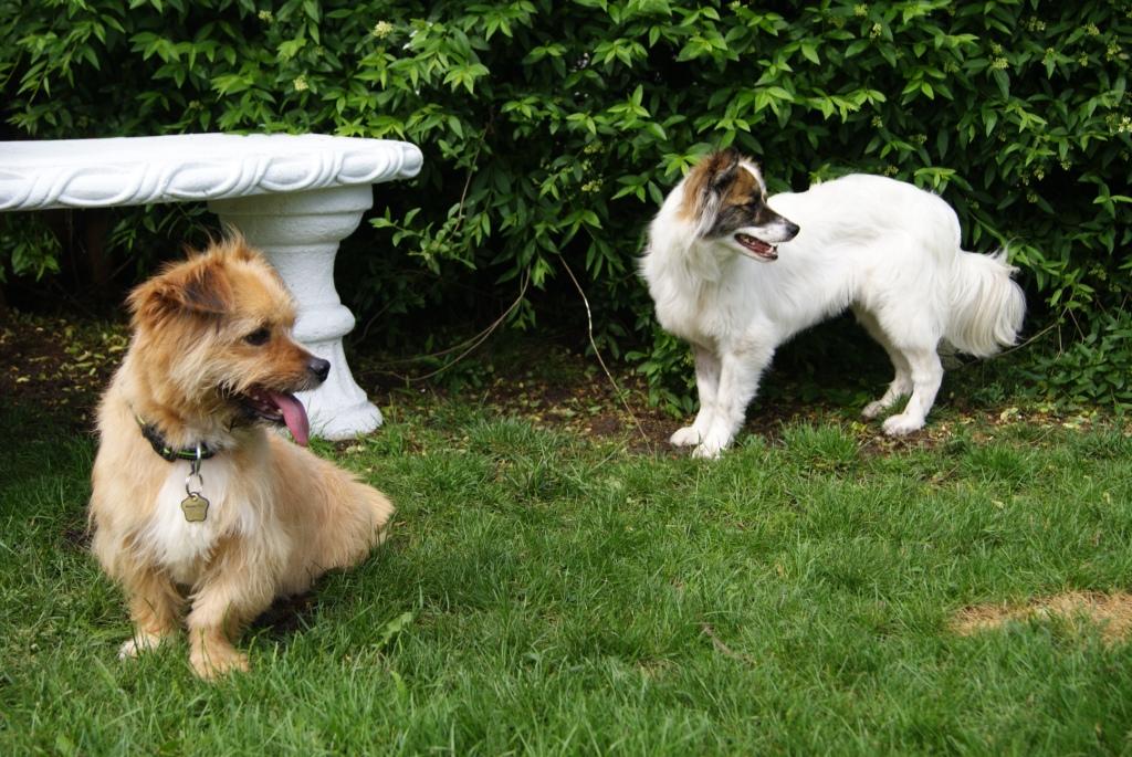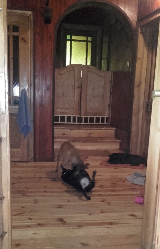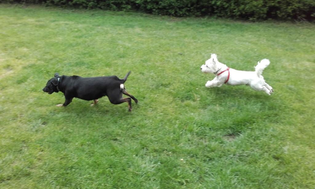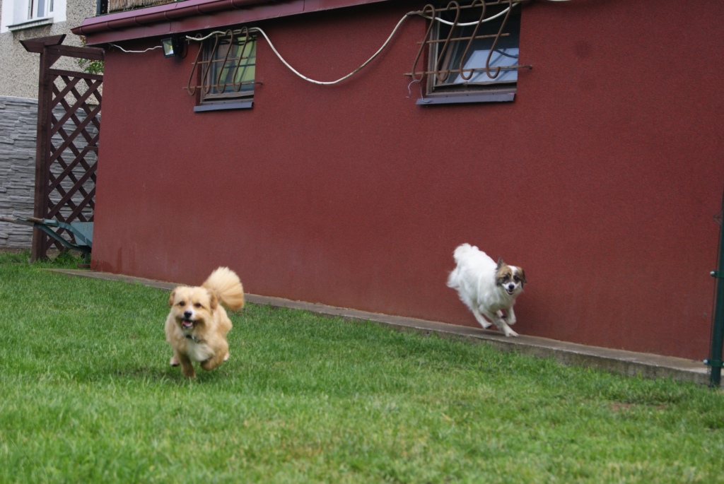 16. Sterylka w sobotę, myślę, że odbędzie się bez przeszkód, ponieważ Karolcia rozruszana i trochę odchudzona. Ile waży, okaże się u weta. Karolcia uwielbia zabawy, zaczepia psiaki, a jak już żaden nie chce, to bierze w zęby sznur i rzuca przed każdym psem po kolei i zachęca :) Na zdjęciach zabawa z Tiną, a moja sznaucerka odpoczywa