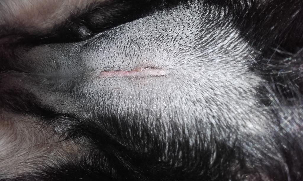 8. Do zdjęcia rany też potrzebowałam pomocnika, bo Karolcia ruchliwa jest "nieco" :) Mam nadzieję, że takie zdjęcie będzie dobre, Karolcia nie chce leżeć na boku, ani na pleckach, a jak już, to wywala głowę do tyłu. Na stojąco nie widać rany, więc musi takie wystarczyć. Obrożę już ma zmienioną na swoją osobistą, ale też co zahaczę końcówkę, to podczas zabawy jej wypada, może rzeczywiście ją podetnę. Mój wet bardzo ładnie zaszywa cięcia i dzięki temu rany lepiej się goją.