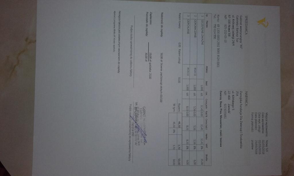 Faktura za odrobaczenie, odpchlenie i szczepienie. 30 zł. zapłaci fundacja ZEA, 30 zł. zapłaciłam ja. -