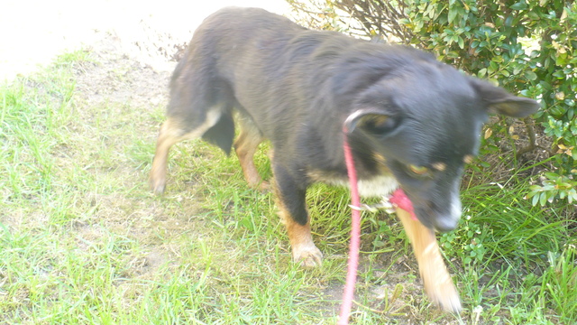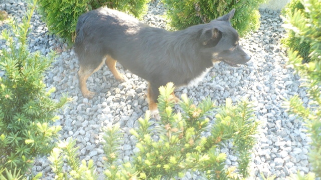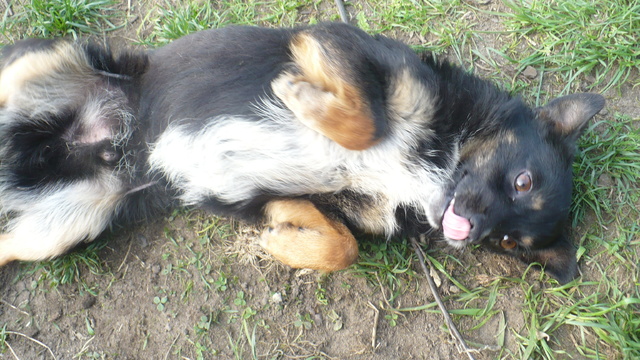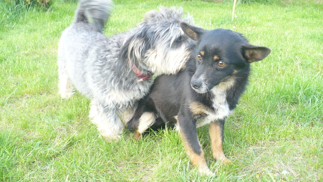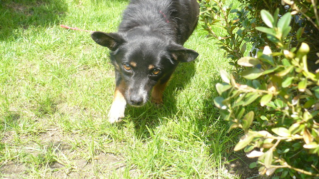 Tropek już ani mocno ani w ogóle nie jest nieszczęśliwy :D Ogonek w górze, domaga się głasków, opiera łapki o moje kolana do miziania wywala brzucho. Apetyt ma bardzo duży, koopa (salonowa - póki co) już była. Chodzi po ogrodzie i ...tropi :) Z psiakami ok. Szronik bardzo go zachęca do zabawy ale chyba zbyt nachalnie :) Ze smyczą nie jest tragicznie. Taki Tropcio rozanielony Wciska się przed Szronika na głaski Hejka :) To ja Tropek - roztropek.
