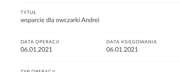 Bazarki: Poker - wpłata 51 zł (22.01.2021). Gabi79 - wpłata z bazarku 600 zł (04.02.2021) Poker - 70 zł wpłata z bazarku (17.02.2021). Gabi79 - Bazarek transoprtowy - 590 zł (09.04.2021 r). Livka - 340 zł (26.04. 2021) b-b- bazarek nr 1 : 80 zł (23.04.2021) b-b - bazarek nr 2 100 zł (10.05.2021) b-b - bazarek nr 3 230 zł (14.06.2021) b-b - bazarek nr 4 130 zł (14.06.2021) Nadziejka bazarek - 75 zł (14.06.2021) Inne: Fundacja ZEA - opłata za piewrszy miesiąc pobytu w hoteliku: opłata hoteliku za miesiąc luty 2021 w kwocie 420 zł Tyśka) -100 zł (od Amika wpłata 16.03.2021) Anula - 200 zł z wątku Czesterka (25.01.2021 r.) Anula - 150 zł na behawiorystę (06.04.2021) - opłacona II wizyta 200 zł (04.05.2021) Zagrodowy Pies Polski 300 zł na behawiorystę (07.04.2021) - 50 zł do pełnych kosztów II wizyty. Zostało 250 zł Livka - 150 zł na behawiorystę (10.04.2021) - 150 zl(opłacona I wizyta).