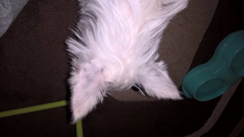 1. Witam miesiąc temu kupiłam szczeniaczka rasy west (piesek jest bez rodowodu). Na początku było wszystko w porządku jednak od 2 tygodni zaobserwowałam na grzbiecie i brzuszku pieska ciemne plamy. Na grzbiecie ma nawet kilka czarnych włosów! Wszystko jednak zrobiło się bardzo niedawno przy zakupie nie miał żadnych plam. Bardzo mnie to niepokoi, jednak weterynarz powiedział, że może być to wada genetyczna. Boję sie jednak, że po trymowaniu będzie to bardzo widoczne i będzie on przypominał dalmatyńczyka;/ Dodam tylko, że widziałam jednego pieska z tej hodowli i nie ma on takich problemów. Czy może ktoś z was spotkał się z takim czymś i czy jest jakaś szansa, że te plamki znikną? Wstawiam kilka zdjęć niestety jakość nie jest najlepsza widać tylko kilka plamek jednak na grzbiecie jest ich znacznie więcej...