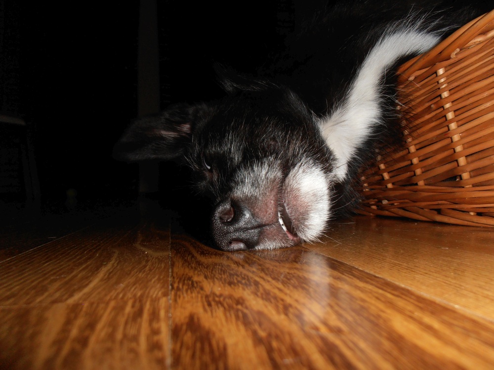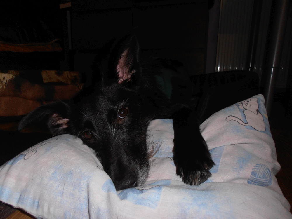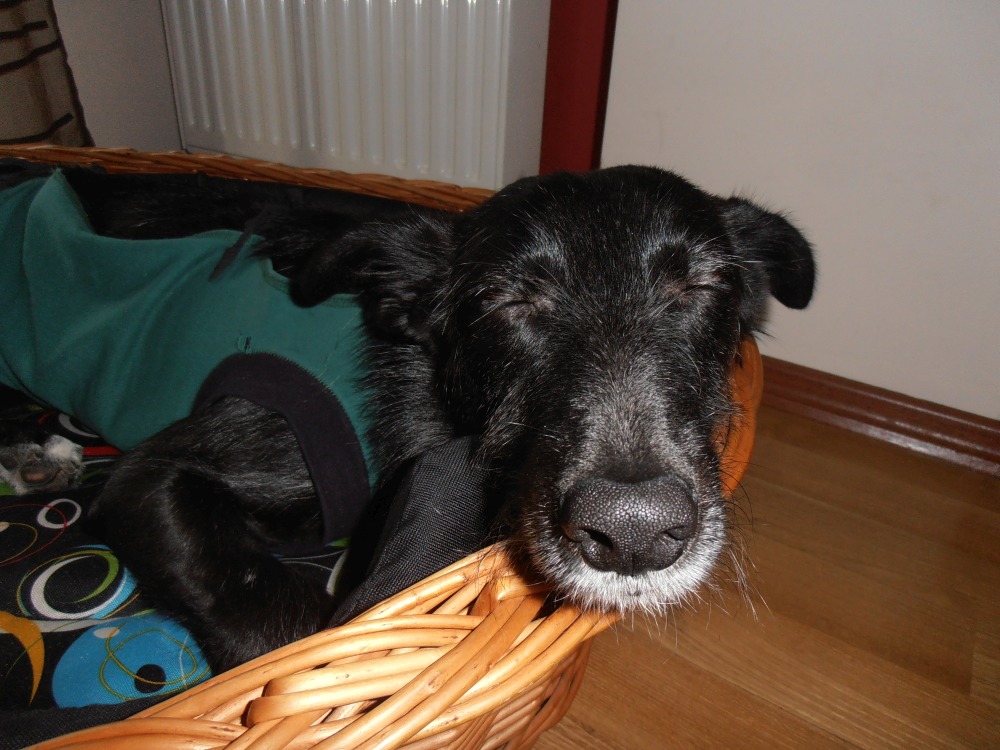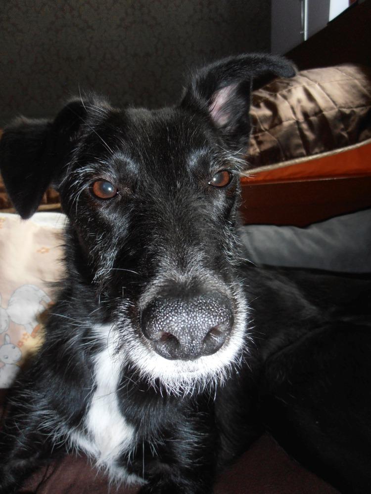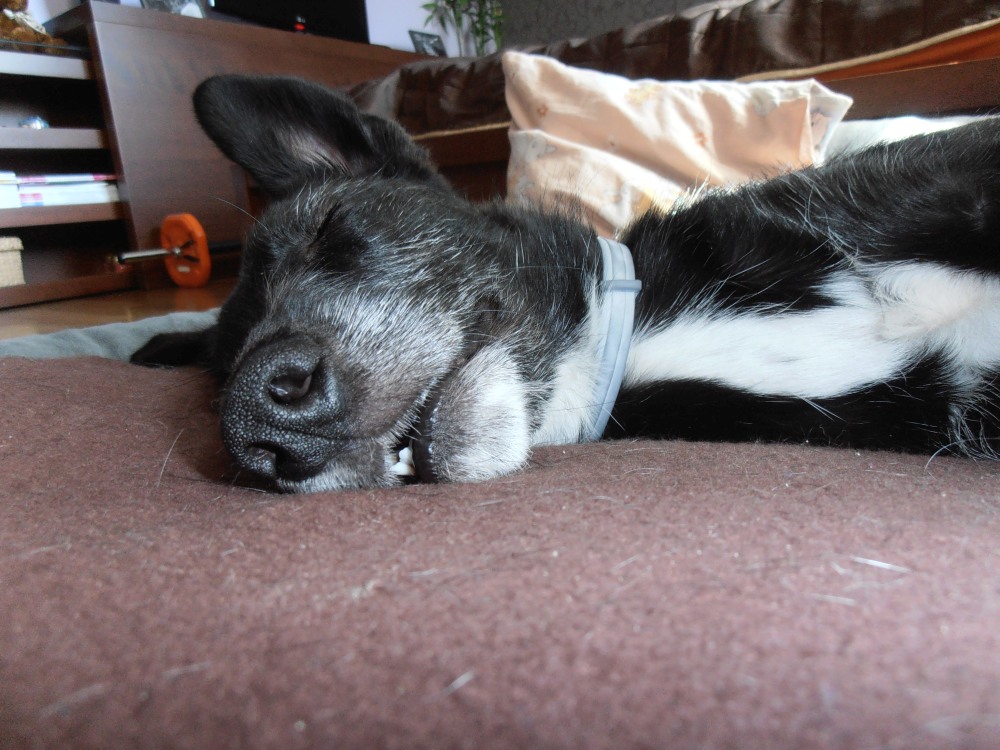 Parę słów o Muszce :) Musia nabiera coraz większej odwagi i pewności siebie, jest taka radosna (jeszcze bardziej niż była) i pełna energii, na spacerach jest już prawie całkiem zrelaksowana, wesoła, chce się bawić i biegać, niektórzy są w szoku, że pies bez łapki tak biega i szaleje. Jeszcze się zdarza, że się czegoś boi np. przechodzącego psa, ale jest to coraz rzadziej. W porównaniu z tym co było a jest, to zrobiła ogromny postęp. Z zostawaniem samej w domu też już prawie nie ma problemu, czasem coś tam sobie cicho pisknie (ale ona ogólnie jest „gadającym” psem), ale już potrafi położyć się na swoje posłanie, a wcześniej pokładała się tylko koło drzwi. Mam nadzieję, że z czasem będzie się czuła zupełnie zrelaksowana pod naszą nieobecność. Ona cały czas jeszcze przechodzi proces przemiany :) Wizualnie też się trochę zmieniła, pyszczek jakiś mniej owłosiony, uszka częściej są klapnięte i czasem jej się śmiesznie wywijają na drugą stronę :) i trochę posiwiała :-o Podobno urosła, tak twierdzi moja siostra i mama, które nie widziały Muszki ponad dwa miesiące, ale może im się wydaje :) Jedyne co mnie martwi to jej ranka na kikutku, która znowu się odnowiła, nawet nie zdążyłyśmy pożegnać się z ubrankiem, a tu znowu ranka :( wprawdzie mała, bo ok 5 mm, a teraz właściwie to jest strupek, który na dniach odpadnie. Ta ranka zawsze długo się goi, bo Musia się w nią uraża, np. jak się kładzie na podłodze lub przy zabawie zdarza jej się „upaść” na kikutka, nie jest to zbyt często, ale to chyba wystarcza. Nawet nie wiem kiedy dokładnie to się stało. Obawiam się, że to się będzie powtarzało, ze względu na to, że ma w takim miejscu amputowaną tą łapkę, ale zobaczymy, może jeszcze to było na tyle świeże, że niewielki uraz wystarczył, żeby się ranka odnowiła. A dodatkowo Muszka lubi sobie tam gmerać, wprawdzie coraz rzadziej ją przyłapuję na tym, ale jak nie widzę to wiem, że tam coś kombinuje bo mam obślinioną nogawkę. To w skrócie byłoby na tyle, w załączniku oczywiście Muszka :)