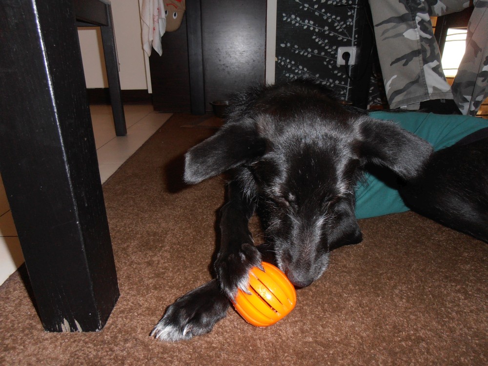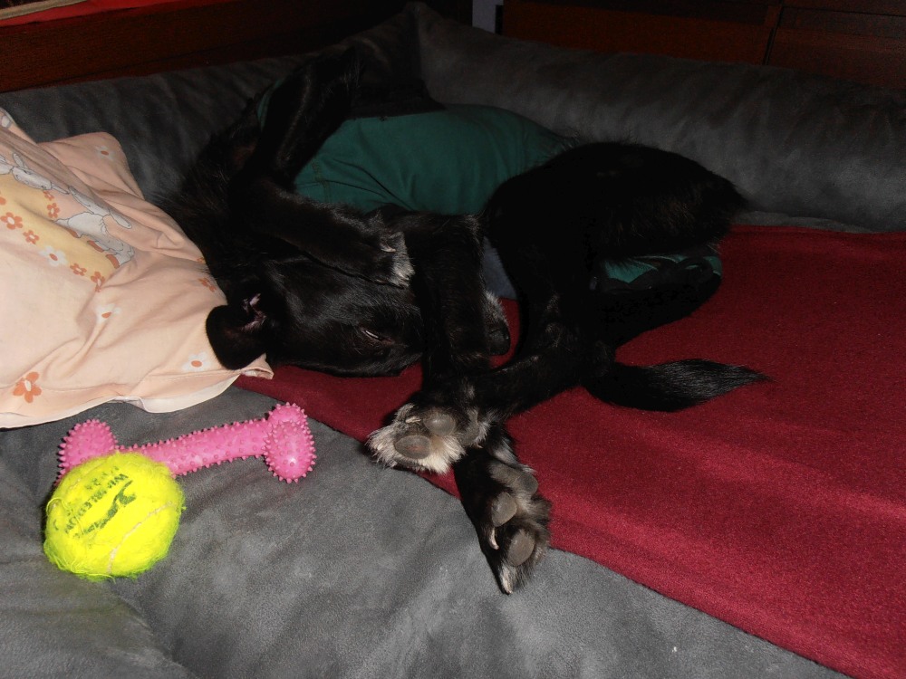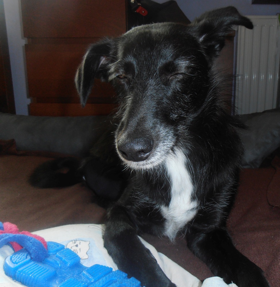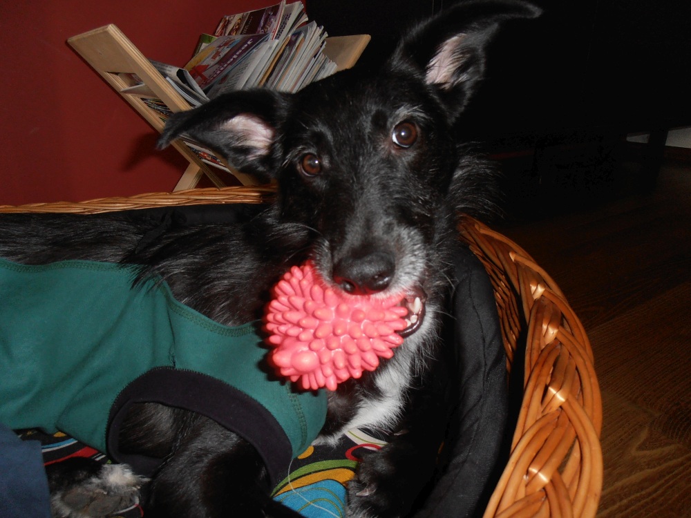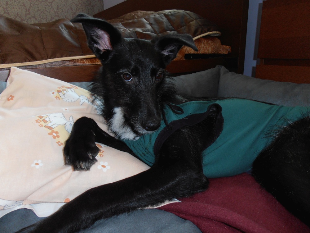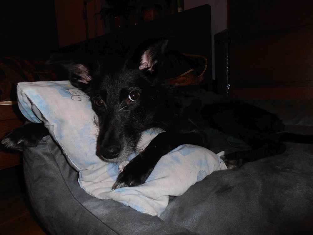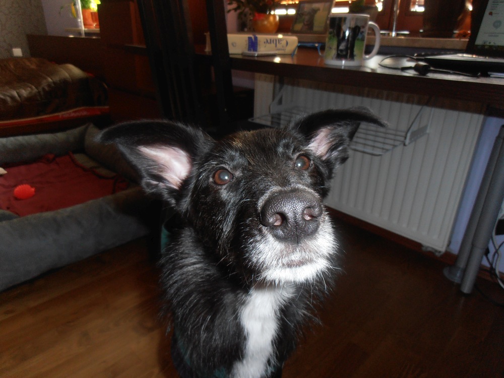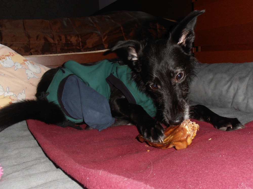 Dawno mnie tu nie było, więc na wstępie dziękujemy za życzenia :) i również życzymy samych dobrych i szczęśliwych dni w Nowym Roku :) U Muszki coraz lepiej, ranka na amputowanej łapce w końcu się zagoiła i niedługo Musia będzie mogła się rozstać ze swoim wysłużonym ubrankiem :) Nauka zostawania samej w domu idzie nam coraz lepiej, był moment kryzysowy co Muszka do swojego wycia dołączyła szczekanie, ale na szczęście szybko jej to minęło. Teraz wygląda to tak, że już wie, że wychodzimy, czeka na smakołyka i dopóki go nie zje, z reguły, jest cisza. A jak zje to zaczyna popiskiwać, ale trwa to dosyć krótko, później od czasu do czasu też jej się zdarzy piszczeć, ale jest to właśnie piszczenie (niezbyt głośne), a nie wycie. A potrafiła wyć jak wilk :) Jeszcze widać, że nie czuje się komfortowo jak jest sama, ale jest już o wiele lepiej niż było, choćby to, że w końcu smakołyk ją zainteresował i potrafi się położyć na dłużej niż parę sekund :) Także nauka jeszcze trochę potrwa, ale póki co, to wszystko zmierza w dobrym kierunku. A poza tym wszystko u niej w porządku, a przynajmniej tak mi się wydaje :) z niej to taki jeszcze duży szczeniak, dzięki czemu mamy zapewnioną dzienną dawkę śmiechu:) a z drugiej strony czasem wydaję się taka poważna i dojrzała :)