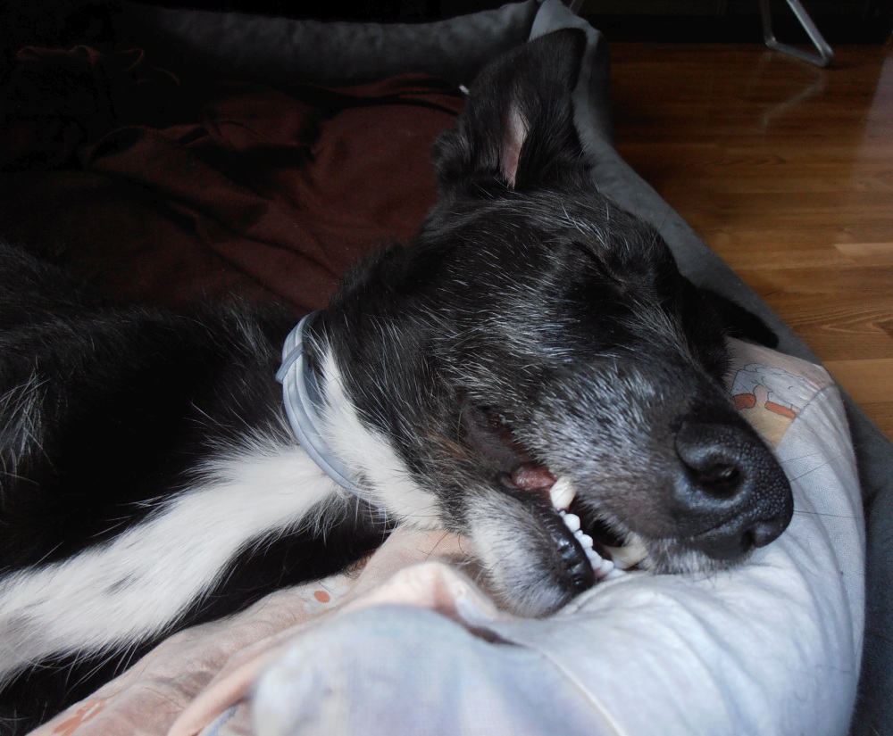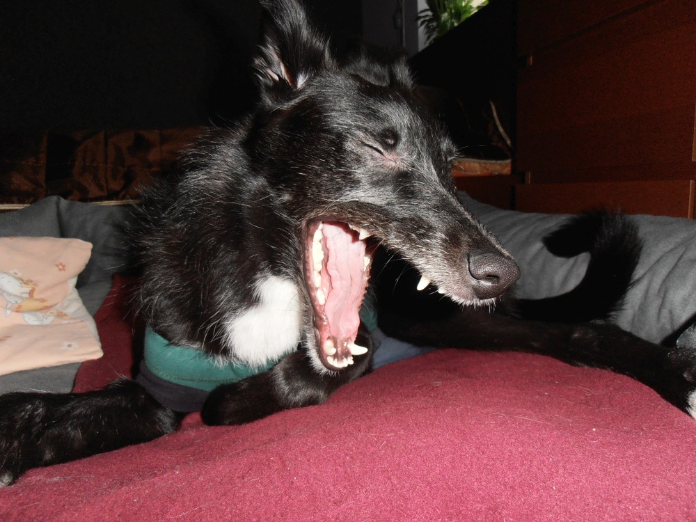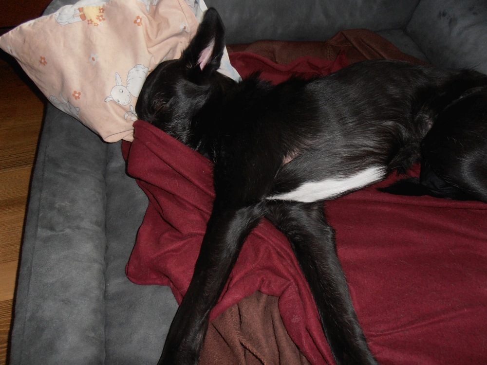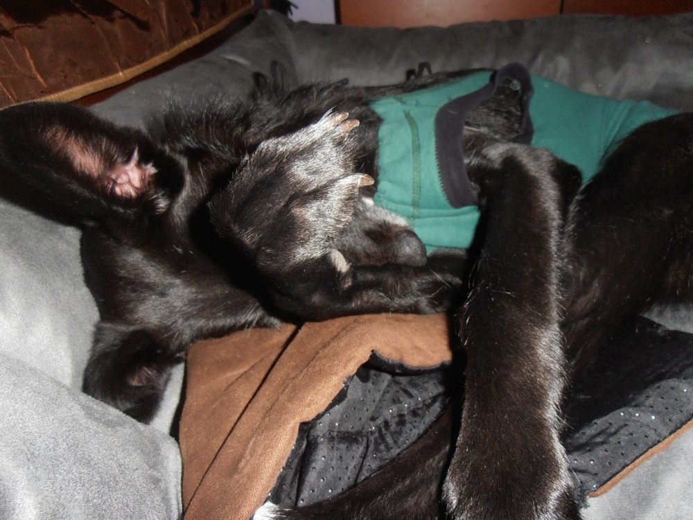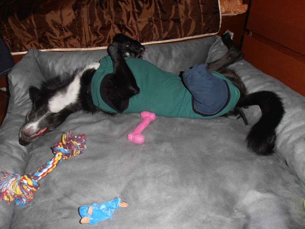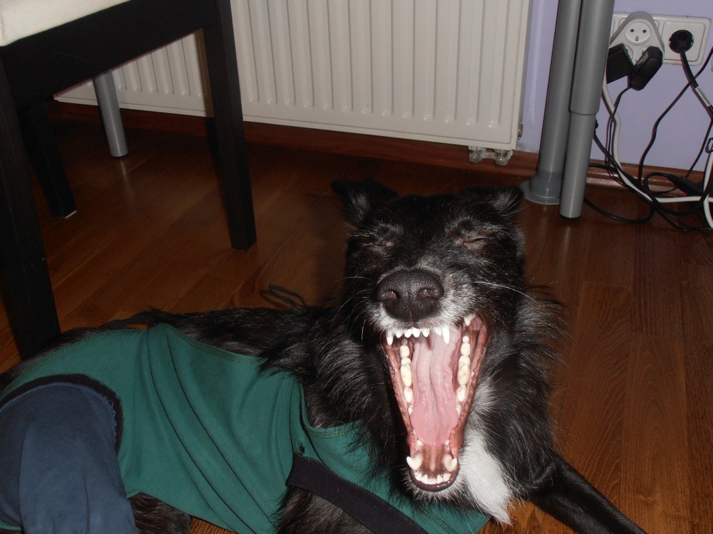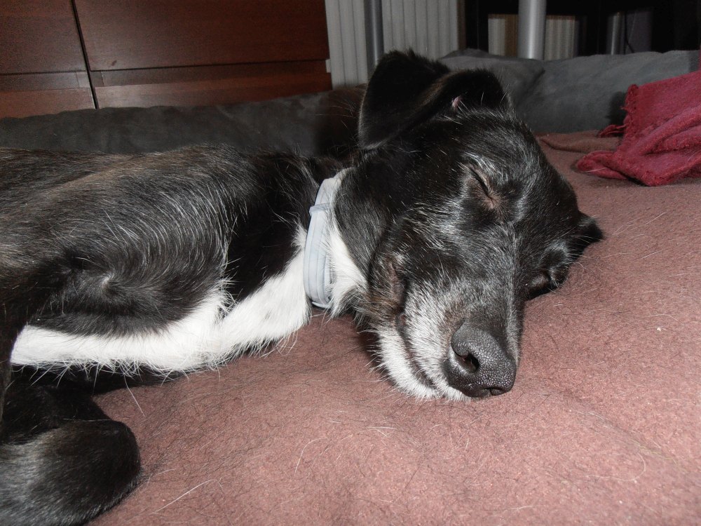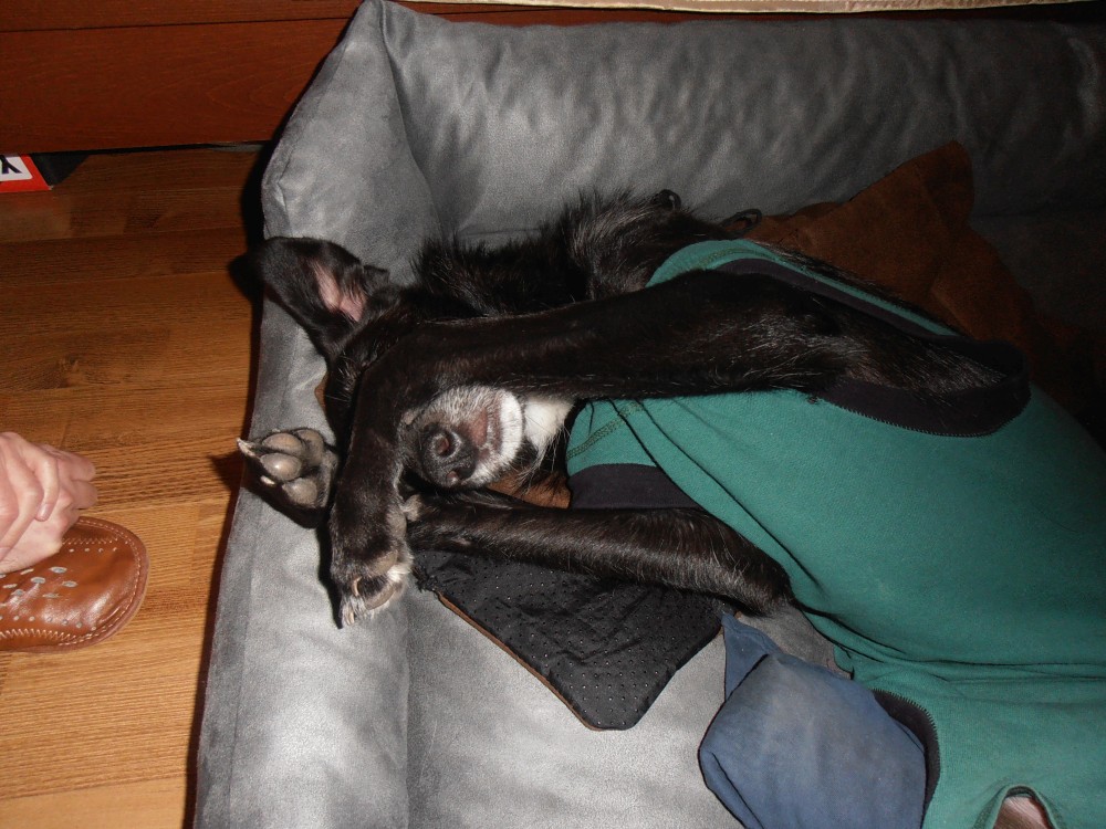 Dawno mnie tu nie było, więc na wstępie dziękujemy za życzenia :) i również życzymy samych dobrych i szczęśliwych dni w Nowym Roku :) U Muszki coraz lepiej, ranka na amputowanej łapce w końcu się zagoiła i niedługo Musia będzie mogła się rozstać ze swoim wysłużonym ubrankiem :) Nauka zostawania samej w domu idzie nam coraz lepiej, był moment kryzysowy co Muszka do swojego wycia dołączyła szczekanie, ale na szczęście szybko jej to minęło. Teraz wygląda to tak, że już wie, że wychodzimy, czeka na smakołyka i dopóki go nie zje, z reguły, jest cisza. A jak zje to zaczyna popiskiwać, ale trwa to dosyć krótko, później od czasu do czasu też jej się zdarzy piszczeć, ale jest to właśnie piszczenie (niezbyt głośne), a nie wycie. A potrafiła wyć jak wilk :) Jeszcze widać, że nie czuje się komfortowo jak jest sama, ale jest już o wiele lepiej niż było, choćby to, że w końcu smakołyk ją zainteresował i potrafi się położyć na dłużej niż parę sekund :) Także nauka jeszcze trochę potrwa, ale póki co, to wszystko zmierza w dobrym kierunku. A poza tym wszystko u niej w porządku, a przynajmniej tak mi się wydaje :) z niej to taki jeszcze duży szczeniak, dzięki czemu mamy zapewnioną dzienną dawkę śmiechu:) a z drugiej strony czasem wydaję się taka poważna i dojrzała :)