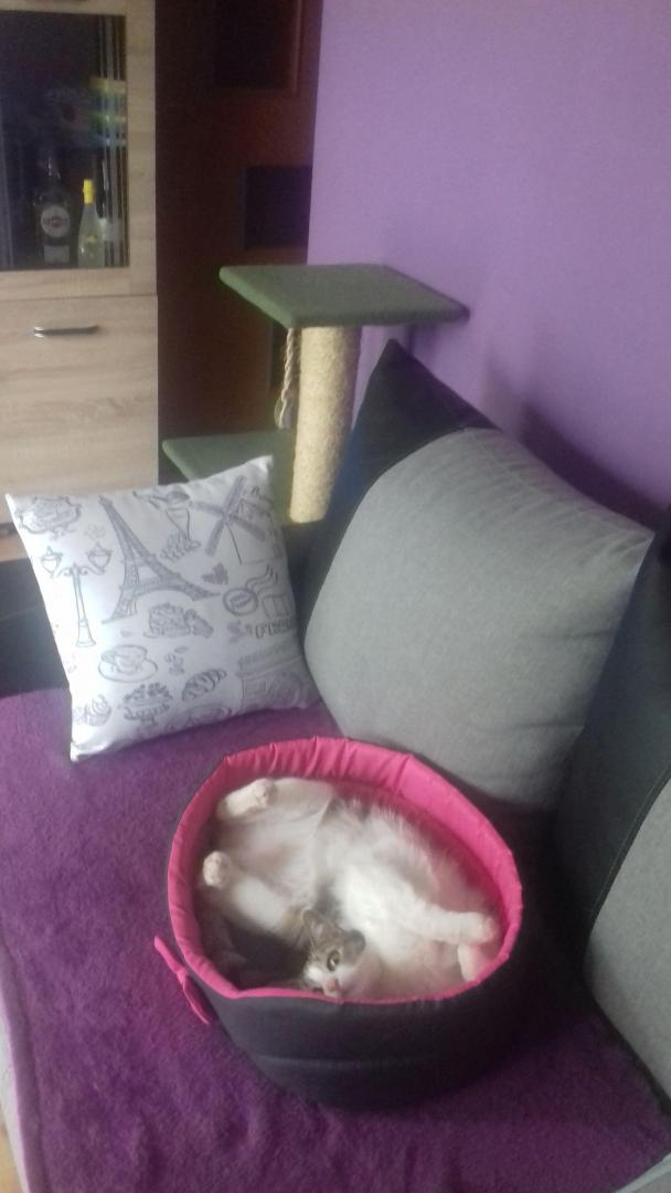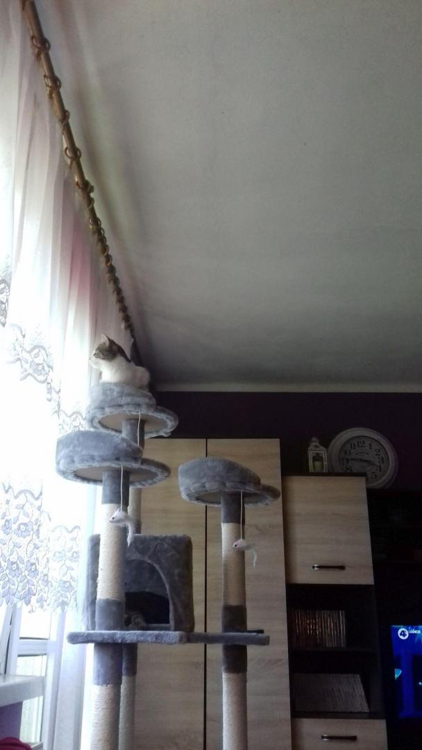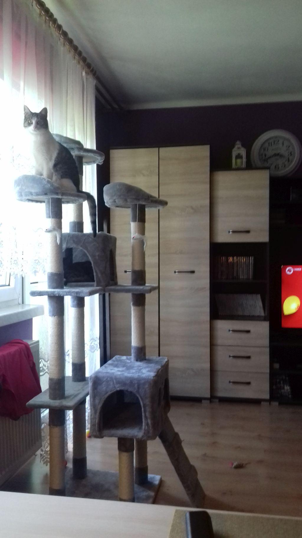 Ponieważ dziewczyny wymyśliły sobie noc na zabawę a ja za tydzień muszę wracać do pracy ( a nie śpię wiadomo ;) postanowiłam " w nagrodę " sprawić im ten oto turbo drapak :) Żeby w dzień nie spały tylko obserwowały świat i w nocy jednak chciały troszkę pospać . Strzał w dziesiątkę - obie chętnie z niego korzystają. Zosia w końcu nie śpi pod prysznicem tylko na drapaku w budce - na zdjęciu ją słabo widać ale śpi w górnym domku. A Zuzia obserwuje wszystko co się da. A to ludzie psy ptaszki. Dodatkowo bardzo chętnie w niego drapią. Efekty od razu widać - w nocy już udaje mi się spać nawet do 4 :) A i później dziewczyny chętnie przychodzą na łóżko i tutaj leżą albo wąchają mnie albo po mnie chodzą :) Dalej jeszcze nie chcą do mnie bliżej podejść ale cierpliwości cierpliwości...ten dzień nadejdzie :) Pozdrawiamy :)