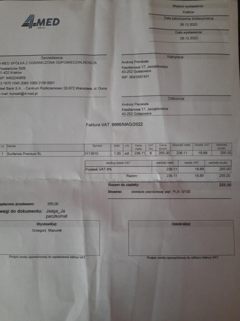 Z mojego bazarku udało się zebrać 214,61 zł na środek do dezynfacji i mycia. Zabrakło 40,39 zł do pokrycia kosztu zakupu Surfaniosu 5 l w cenie 255 zł. brakującą kwotę odliczę tu od wpłat na Lindę, bo jednak przy niej jest największe zużycie środków czyszcząco/dezynfekcyjnych. -