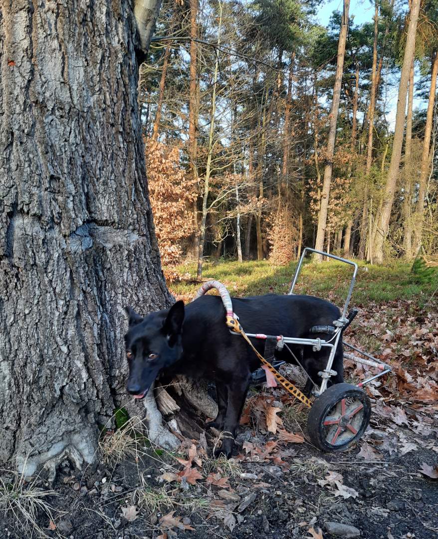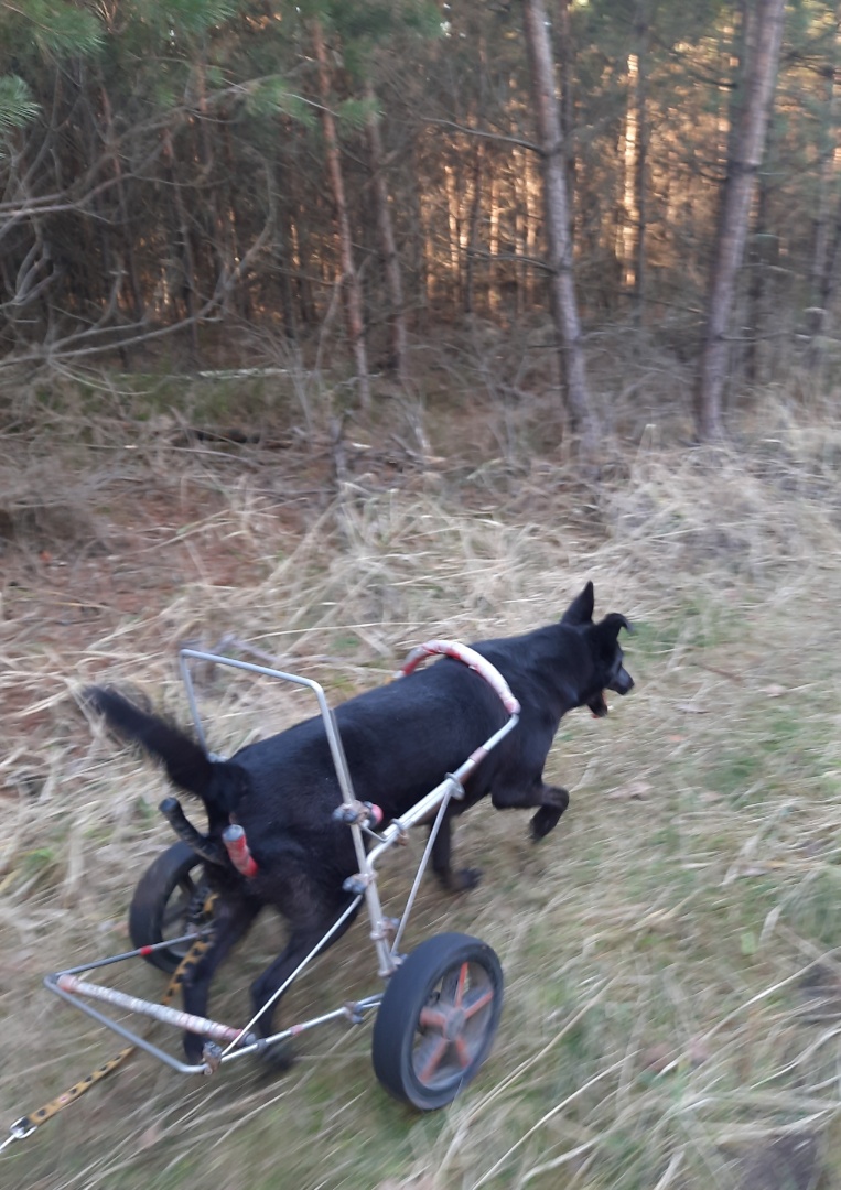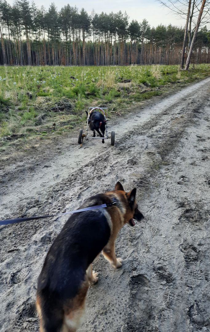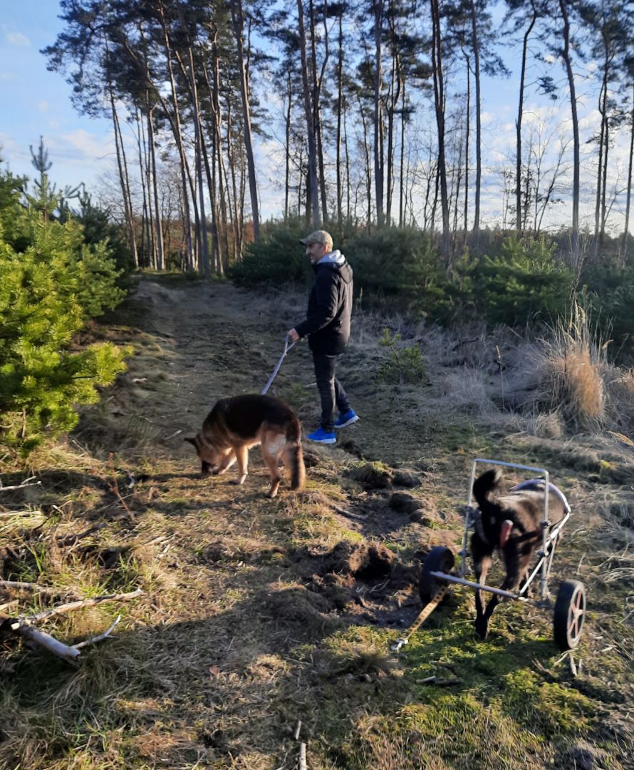 Nie mamy, jeździmy samochodem aż pod Orzesze. U nas mało lasów i zapuszczone. Tylko na spacery od wiosny do jesieni i na sprawne psy. Dlatego jeździmy tam. Lasy są piękne, drogi szerokie, Linda bez problemu sobie sama radzi. Minusem jest to, że mieszczą się w aucie tylko dwa psy. I w bagażniku lindowy powóz