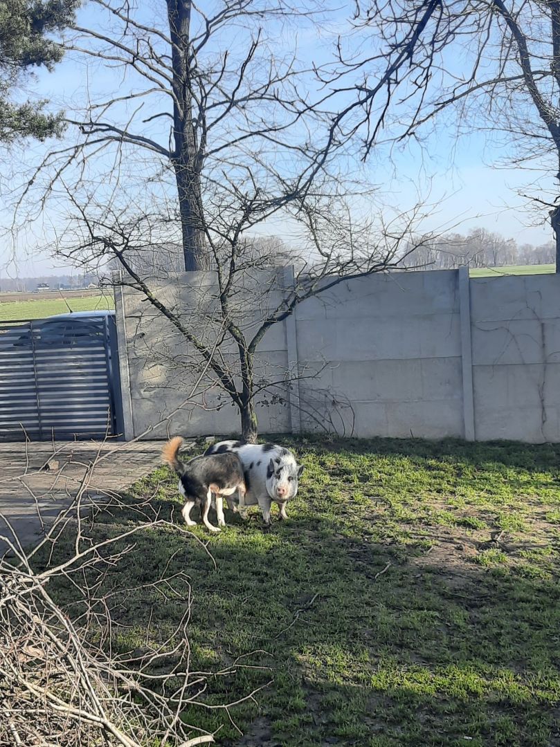 Oczywiscie, caly czas "gada", jakby opowiadała. Podchodzi, zacheca do kontaktu, przystawia ciało. W zależności od tego, co komunikuje, to wydaje różne dźwięki. Jak jest zadowolona, to są to odgłosy takie dzidziusiowe, cichutkie pod nosem. Coś jak "swiergotki" przytulających się szczurków. Nie ten dźwięk, ale porównywalny w odbiorze. Od razu słychać, że istota szczęśliwa. Kiedy jest niezadowolona lub nagle cos ją zdenerwuje, to kwiczy. Rano, gdy czeka na śniadanie i wypuszczenie z zagrody, to jest chrumkniecie- gadanko i tak aż odezwę się przez okno. Jesli cos robie w ogrodzie, to cały czas jest blisko i do mnie nadaje. Kiedy my ją zaczynamy głaskać, to przewraca się na bok, wywala nóżki i trzeba głaskać i drapać po tłustym brzuchu, pod pachami i w pachwinkach. Grey jej pasuje, bo jest spokojny, nie biega, nie stanowi zagrożenia. Chodzi za nią, bo reaguje na czyjś ruch. Do tego jej nie widzi, a niektóre psy przy zapoznaniu najpierw ją oszczekuja, doskakują. Nic nie robią, ale ją to instynktownie denerwuje.