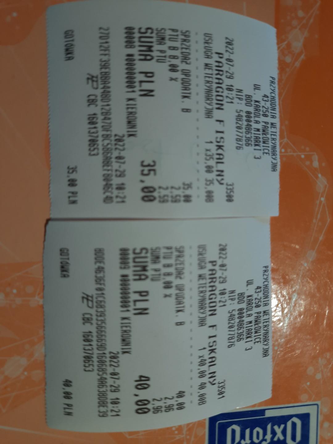 Rozliczenie lipcowe -oplata będzie rozbita za hotelowanie i za karmę osobno. Niestety, ZUS mamy teraz naliczany od obrotu, a nie stały, więc gdybym doliczyła do paragonu karmę, ktora kupilam i zapłaciłam podatek, to zwiększyłby się obrót i ZUS oraz dodatkowo drugi raz musielibyśmy płacić podatek. Kwota 450 zł nie ulega zmianie, tylko paragon hotelowy wynosi 305 zł, a reszta to zwrot za zakupioną karmę i tak prosiłabym zaznaczyć we tytule wpłaty. Do tego wstawiam paragony za dwie wizyty u weta, badanie USG i leczenie. Paliwo do podziału 2x7,50 zł. Razem 625 zł.