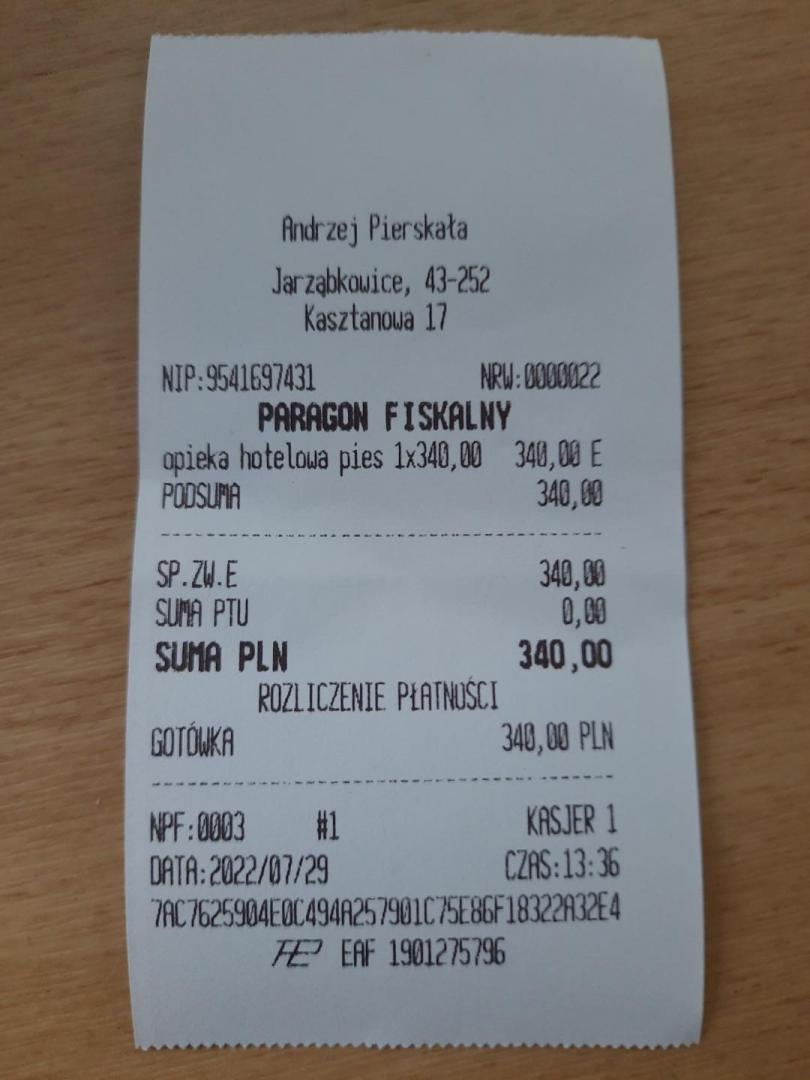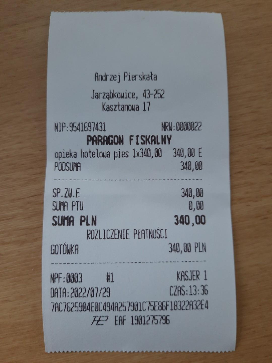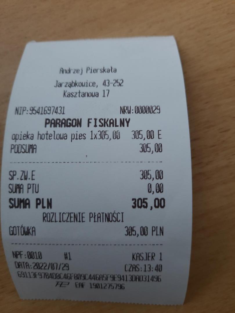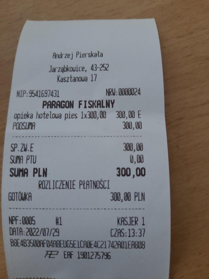 Chcialam rozliczyć za lipiec Dylana. Tylko teraz oplata będzie rozbita za hotelowanie i za karmę osobno. Niestety, ZUS mamy teraz naliczany od obrotu, a nie stały, więc gdybym doliczyła do paragonu karmę, ktora kupilam i zapłaciłam podatek, to zwiększyłby się obrót i ZUS oraz dodatkowo drugi raz musielibyśmy płacić podatek. Kwota 500 zł nie ulega zmianie, tylko paragon horelowy wynosi 340 zł, a zwrot za zakupioną karmę 160 zł.