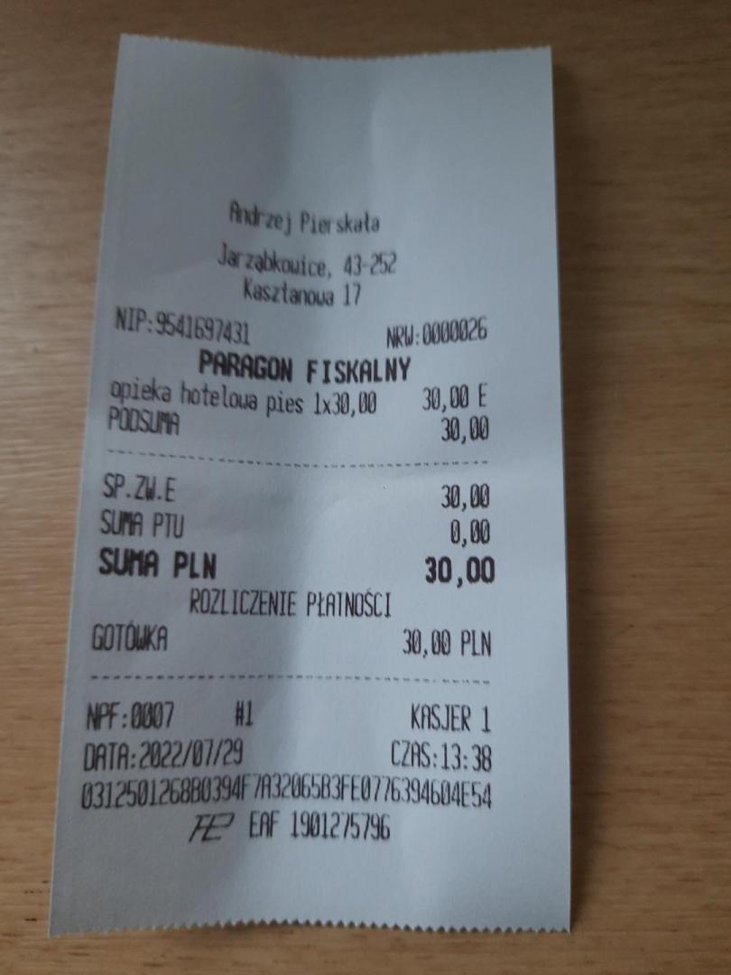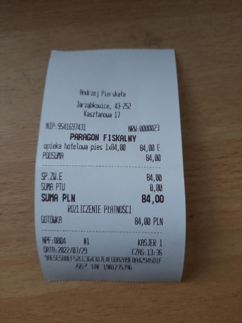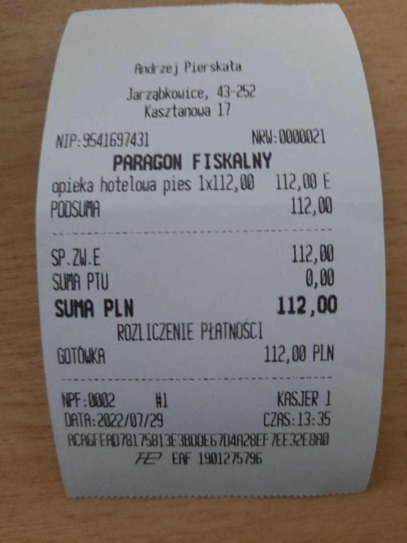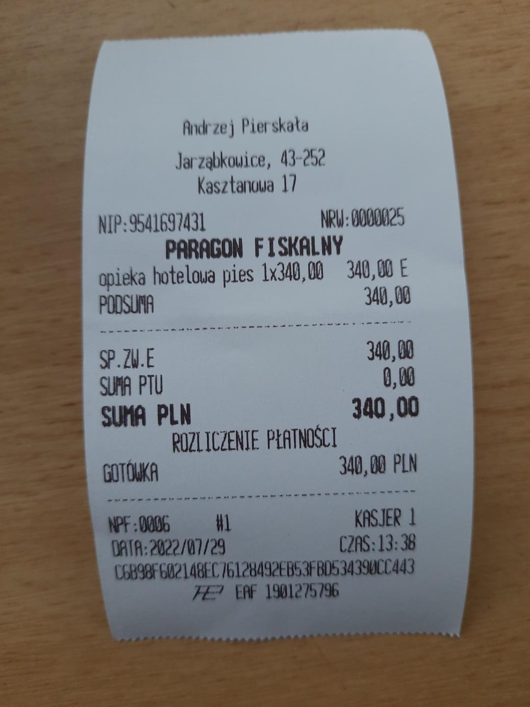 Chcialam rozliczyć za lipiec Dylana. Tylko teraz oplata będzie rozbita za hotelowanie i za karmę osobno. Niestety, ZUS mamy teraz naliczany od obrotu, a nie stały, więc gdybym doliczyła do paragonu karmę, ktora kupilam i zapłaciłam podatek, to zwiększyłby się obrót i ZUS oraz dodatkowo drugi raz musielibyśmy płacić podatek. Kwota 500 zł nie ulega zmianie, tylko paragon horelowy wynosi 340 zł, a zwrot za zakupioną karmę 160 zł.