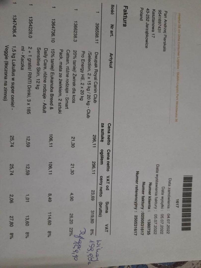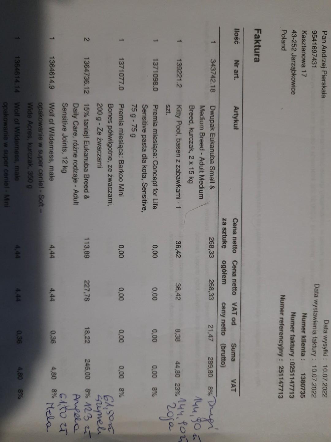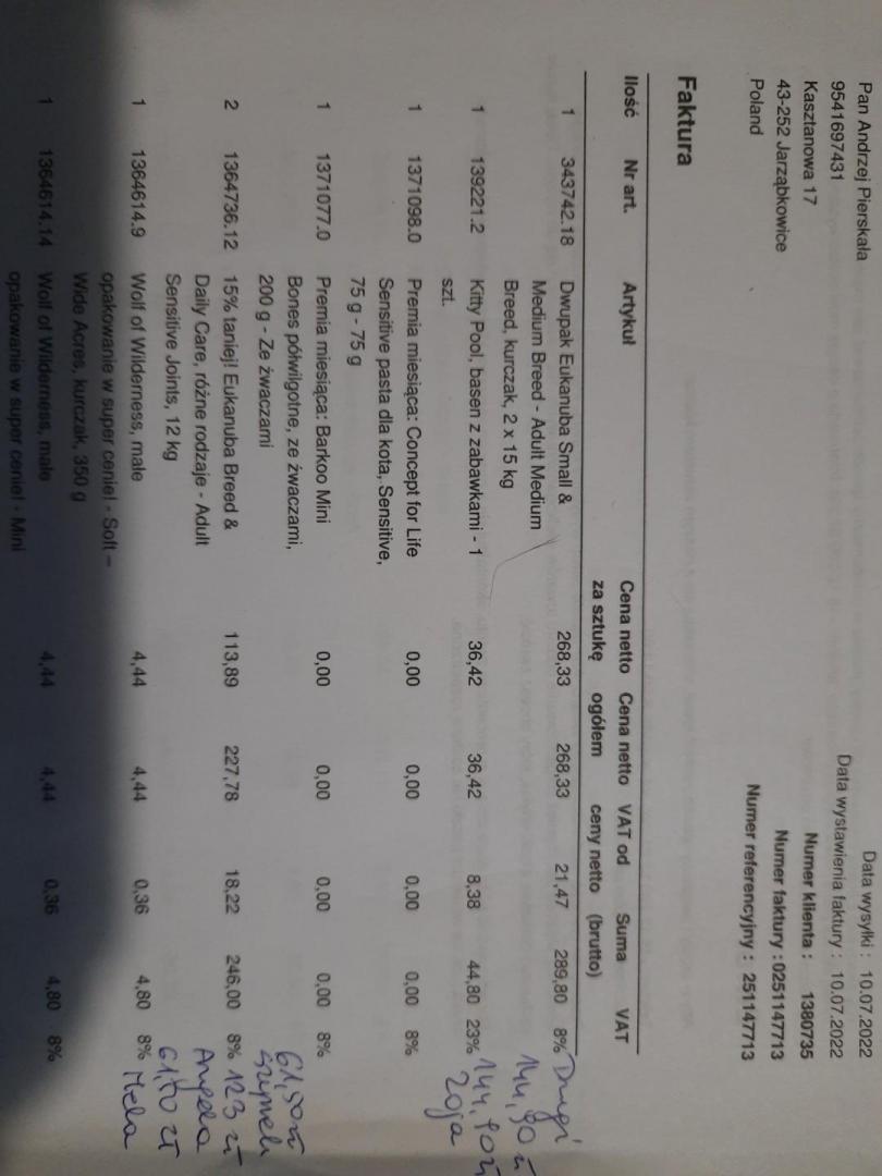 Rozliczenie lipcowe -oplata będzie rozbita za hotelowanie i za karmę osobno. Niestety, ZUS mamy teraz naliczany od obrotu, a nie stały, więc gdybym doliczyła do paragonu karmę, ktora kupilam i zapłaciłam podatek, to zwiększyłby się obrót i ZUS oraz dodatkowo drugi raz musielibyśmy płacić podatek. Kwota 235 zł nie ulega zmianie, tylko paragon hotelowy wynosi 112 zł, a reszta to zwrot za zakupioną karmę i takprosiłabym zaznaczyć we tytule wpłaty.