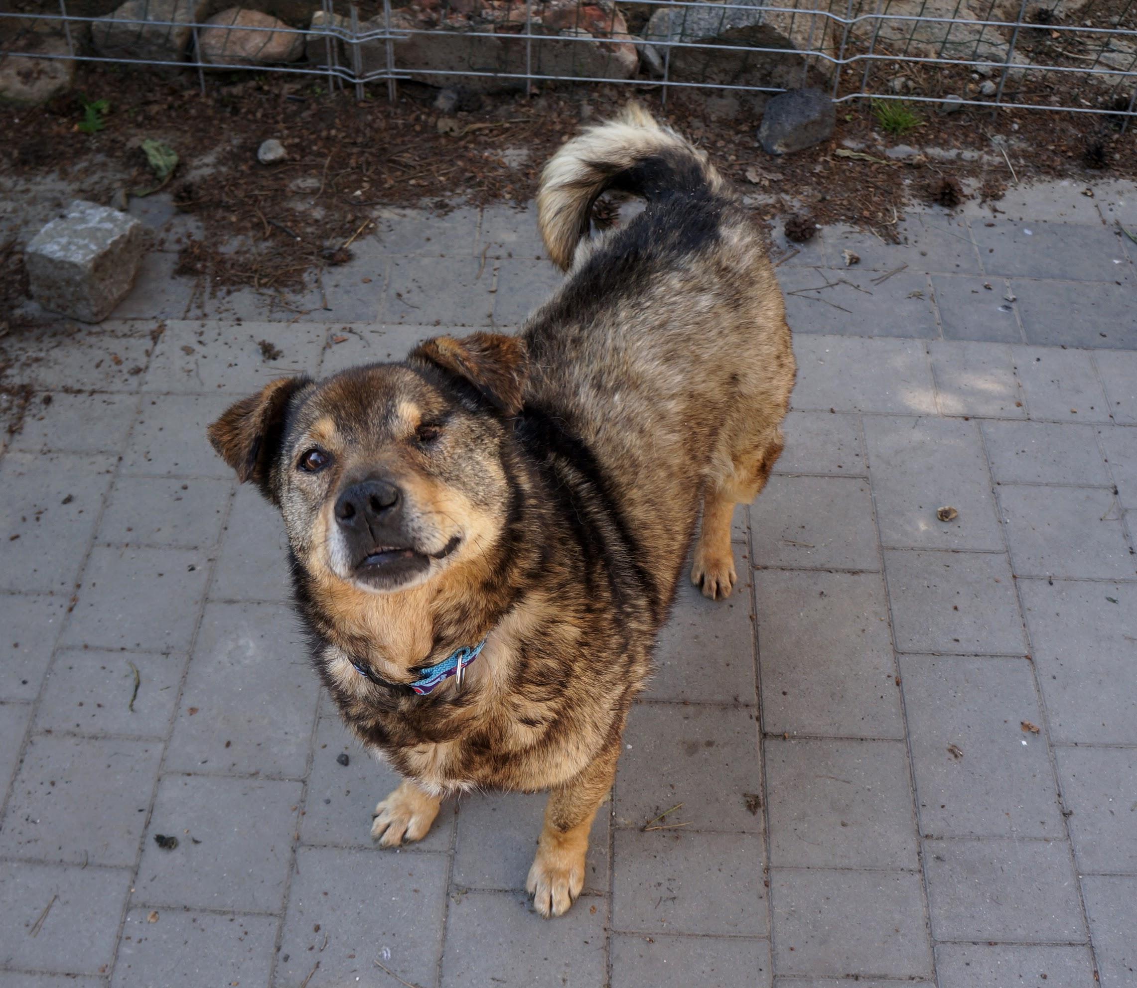 Na moj widok juz merdal ogonem, daje się głaskać, choć wzdryga się przy każdym wyciągnieciu ręki w stronę jego głowy. Uspokaja się po kilku głaskach. Do domu bal się wejść ale bez problemu dal się wziąć na ręce. Daje sobie przypinać smycz. Tylko jeść nie chciał za bardzo, ale to pewnie z emocji. Nawet Andżela go zaakceptowała. Oczodol do zabiegu i zaszycia powiek. Zbiera się w nim zielonkawa ropa. Po ogarnieciu będzie elegancki pies z klasą. -