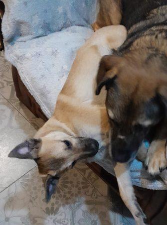 Gabi jest jednym z tych psów, które sobie ustalają miejsce u nas w domu, dostosowują się. Jest już całkiem zgrana i jeśli szybko nie znajdzie domu, to trudniej będzie jej się przestawić. Zaczyna sobie gospodarzyć z Zoją, Kretem i Malinką.