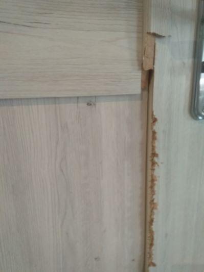 Nuuka była bardzo niezadowolona że Dżekuś wychodzi,a a ona zostaje, więc mam karę .... Ona wygryzła dziurę już na początku pobytu, ale teraz powiększyła ją do takich rozmiarów (buta położyłam żeby zwizualizować wielkość otworu - to but nr 38 ) Nie mogę pojąć jak ona to zrobiła tymi małymi ząbkami, to nie są jakieś pancerne drzwi, ale jednak są wzmocnione wdłuż i w poprzek ramy listwami z drewna, zgryzła je na drzazgi, tylko jeden najkrótszy kawałek w całości został ... -