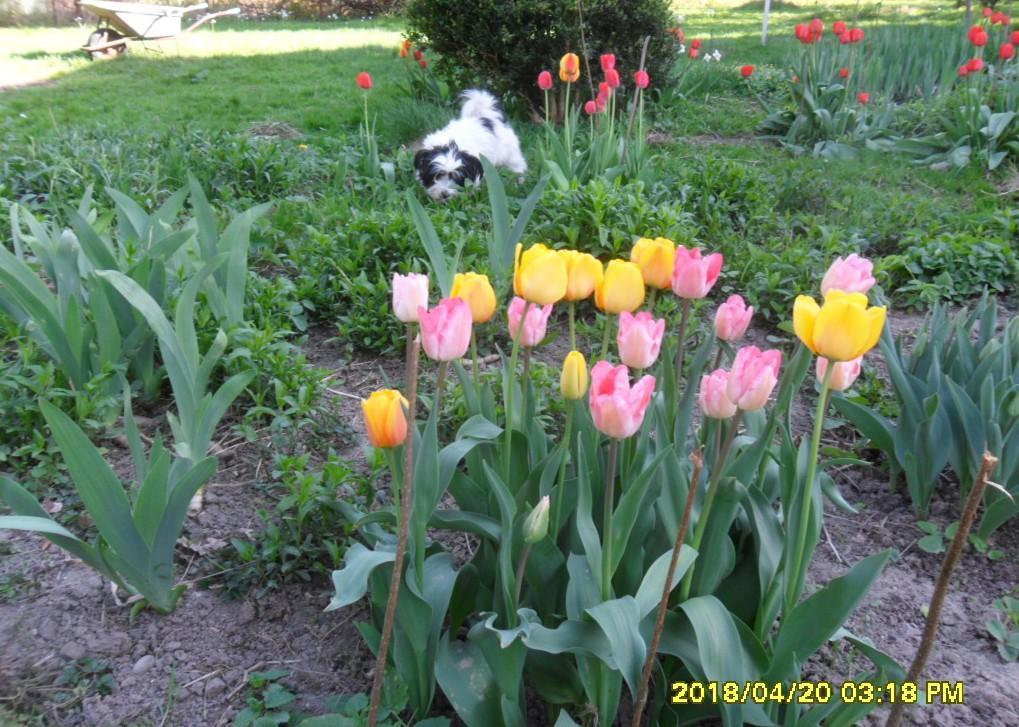 Pozdrawiamy ! :-) Internet u nas raz jest, raz nie ma, a raczej nie ma. 3 tyg temu pościnali 200 letnie dęby co to oparły się grudniowej wichurze a które teraz padając skutecznie przywaliły kable linii telekom. na całej długości ulicy. I tak leżą i kable i biedne dęby. Wczorajszy Lolo buszujący w tulipanach;