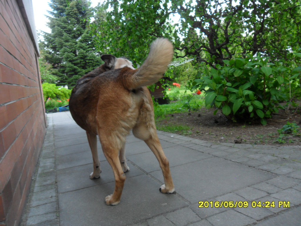 ( Smyczku nie czytaj..) I to robi ... Znowu nawiał z ogrodu, cichaczem. Nie wiem ile go nie było ?. 15 minut, 20-ścia ? Kierunek ten sam.Las! Coś zaskoczył ostatnio. Szczęście że wraca. Wzmogłam czujność wjeżdżając do ogrodu..;-) Cała moja piątka dorwała się dziiś wieczorem do suchej psiej karmy, co to dostaliśmy kiedyś od młodej Pary (zamiast kwiatów). Własnie pakowałam worki do samochodu, gdy coś mnie odciągnęło , no i zapomniałam...Nawet się dziwiłam, że psy nie lamentuja pod drzwiami jak to zazwyczaj bywa.. Wracam po godzinie , a na około same porozrywane torby biedronkowych "przysmaków". Nie wiem ile tego zeżarły ? Patrząc na ich wzdęte brzuchy, raczej sobie nie żałowały....