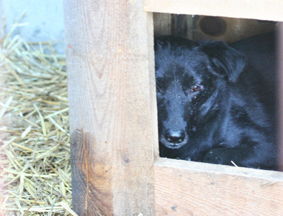 Nurtuje mnie sprawa tej suczki 92/M... Sprawdzę w domu oryginały zdjęć. Na moje oko to właśnie ona w tej budzie. Na 99,9%. Luzem biegające ufociłam 3: rudego 66/K, małą szorstkowłosą beżową sunię i tę co podjada z miski dużemu beżowemu i nie daje się złapać. -