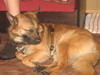 Kiedy byliśmy na Mazurach, w Wilczym szańcu spotkaliśmy panią, która najpierw zaniemówiła na widok beldonka, a potem cudnie roztłumaczyła jego imię- Bel- Don, czyli Piękny Pan... i to by się zgadzało, prawda? Jeśli ktoś myśli inaczej, pozywam go na walkę pieszą alboli też konną, na noże, widelce, albo łyżki- obiad niedługo. Jasne, że tusia rządzi, ale lubią się z Beldonem, to widać. Na początku tusia chowała się pod taboret, na którym siedział jej pan. Beldon kładł się obok i delikatnie, powolutku czołgał w stronę Tusi. Kiedy jej się wydawało, że jest za blisko, zacvzynała warczeć, a Beldon z westchnieniem się wycofywał, po chwili taniec zaczynał się od początku, ale Tusia za każdym razem pozwalała podejść się nieco bliżej. Teraz jedzą z jednej miski, ale nie równocześnie.