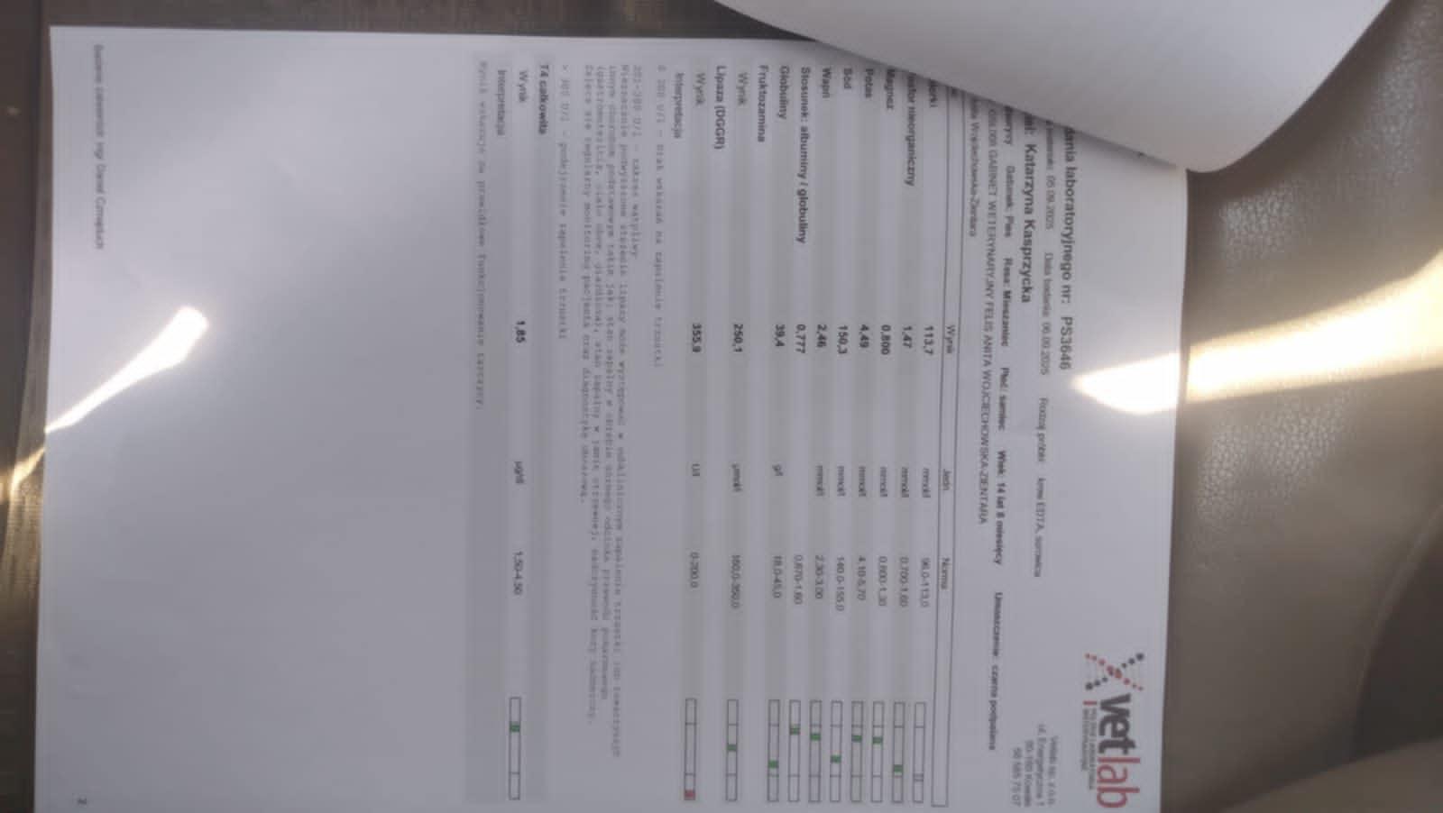 Bardzo proszę o pomoc... Wiadomość z hoteliku: Są wyniki, lipaza trzustkowa jest zawyżona i świadczy o zapaleniu trzustki ( zapewne przewlekle), ale jeśli jest wszystko ok, jest apetyt, kupy w porządku, żadnych wymiotów itd, to na razie wskazane tylko chude jedzenie - taka sobie dieta , bez wspomagania enzymami. Jak mocno podwyższona, tego nie wiem ( nie wiedziałam że to tak będzie wyglądać....) i do określenia o ile przekracza normę, potrzebny jest osobny parametr - to co zapisane na kartce wraz z ceną - do Waszej decyzji czy robić, bo muszę dać im znać. Co do robaków, dla pewności można zrobić testy na lamblie( chociaz na pewno tam było zawyżone przez trzustkę). Klinika praktykuje też odrobaczenie tabletami które mogą wybić wszystko, jeśli faktycznie jest, z pominięciem testów - wiem że większość tego nie pochwala, ale ludzie często tak robią z oszczędności, więc wspomniała o takim rozwiązaniu Podpowiedzcie co mam powiedzieć Kasi? Na co się decydujemy?