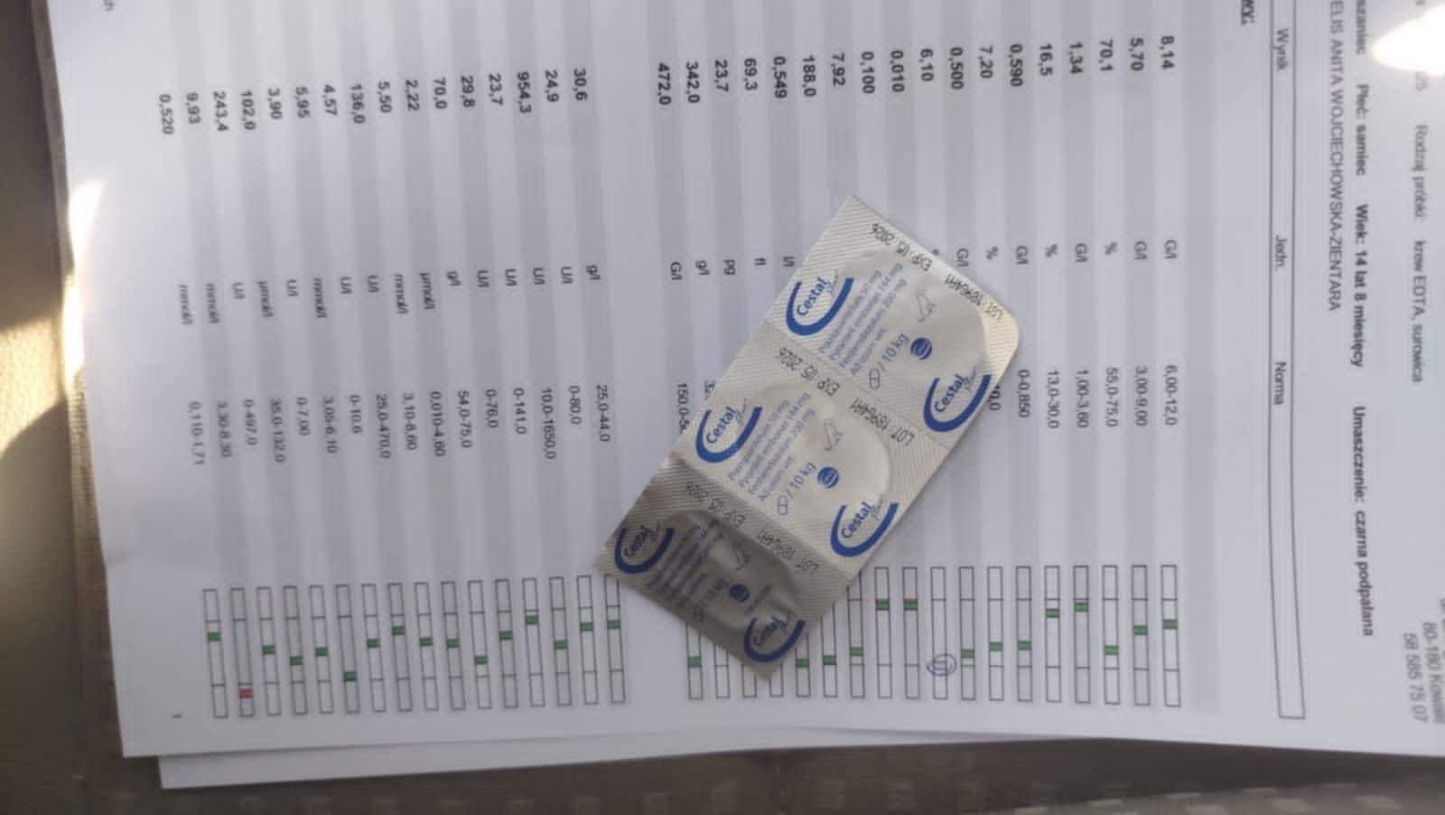 Dała. Już się tak nie boi Kasi. Nie zwiewa jak ona do niego idzie. Co prawda nie je jak jedzenie zostaje na podłodze ale ostatnio jak mu Kasia zostawiła na łóżku gdzie leżał to jakoś jedzenie zniknęło :). Dalej wokalizuje i to porządnie ale malutkimi krokami chyba idzie w dobrym kierunku :). Wczoraj Kasia dzwoniła w sprawie dodatkowych badań. Ponieważ Lipaza jest dość wysoka padło pytanie czy z krwi, która już została Maurycemu pobrana i jest przetrzymywana w laboratorium przez 7 dni, zrobić dodatkowe badania trzustkowe żeby wiedzieć dokładnie czy ta wysoka lipaza to od trzustki czy coś innego. Koszt 140 zł. Ponieważ trzeba było podjąć szybko decyzję nie konsultowałam na wątku ale prosiłam o zrobienie tych badań. Mamy już krew, nie trzeba ciągnąć Maurycego do gabinetu to dowiedzmy się jak najwięcej. Mam nadzieję, ze macie podobne zdanie. Reszta wyników zaskakująco dobra ale z tego możemy się tylko cieszyć :). Dostał jakieś tablety, te co na fotce, ale za skarby nie pamiętam na co to...