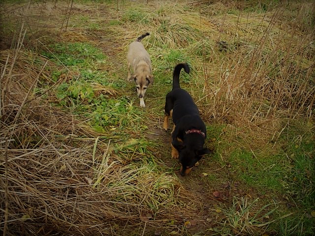 I dzisiejsze spacery, Pola raczyła się wysiusiać...........................istne szaleństwo, jednak chodzenie po mokrej ziemi przekracza jej możliwości, księżna Pola oraz księżna Beti szukają zielonej trawki aby postawić na niej swoje piękne stopy..............są bardzo zdegustowane błotnym podłożem na wychodzonych ścieżkach. -