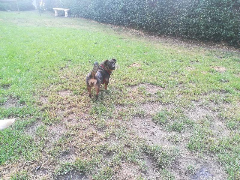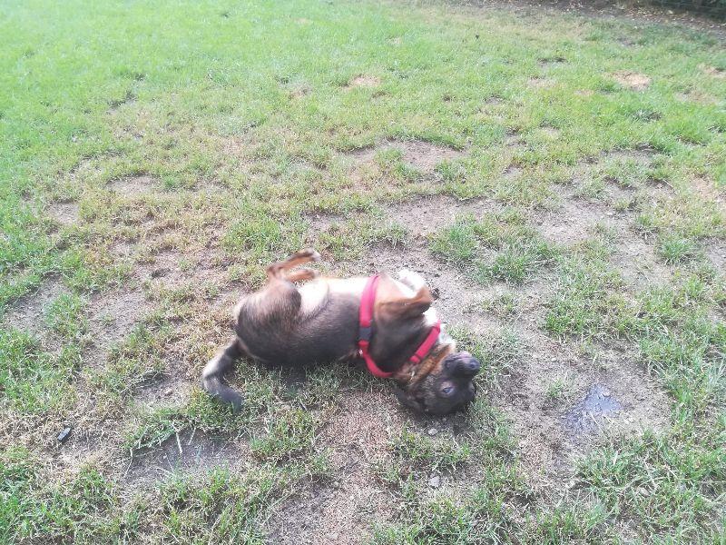 Mufcia całą noc przespała ładnie na swoim posłanku, jak zgasły światła w nocy to zaszczekała tylko kilka razy ale na dźwięk głosu uspokoiła się w nocy troszkę sobie coś mruczała :). Na spacerkach grzeczna i bardzo ciekawa, załatwia swoje potrzeby od razu, spotkała już sarnę ale była spokojna no bo ma smyczy. Dzisiaj dużo spała, odsypiała wczorajsze wrażenia i stresy. I zdjęcie ze spacerku :D.