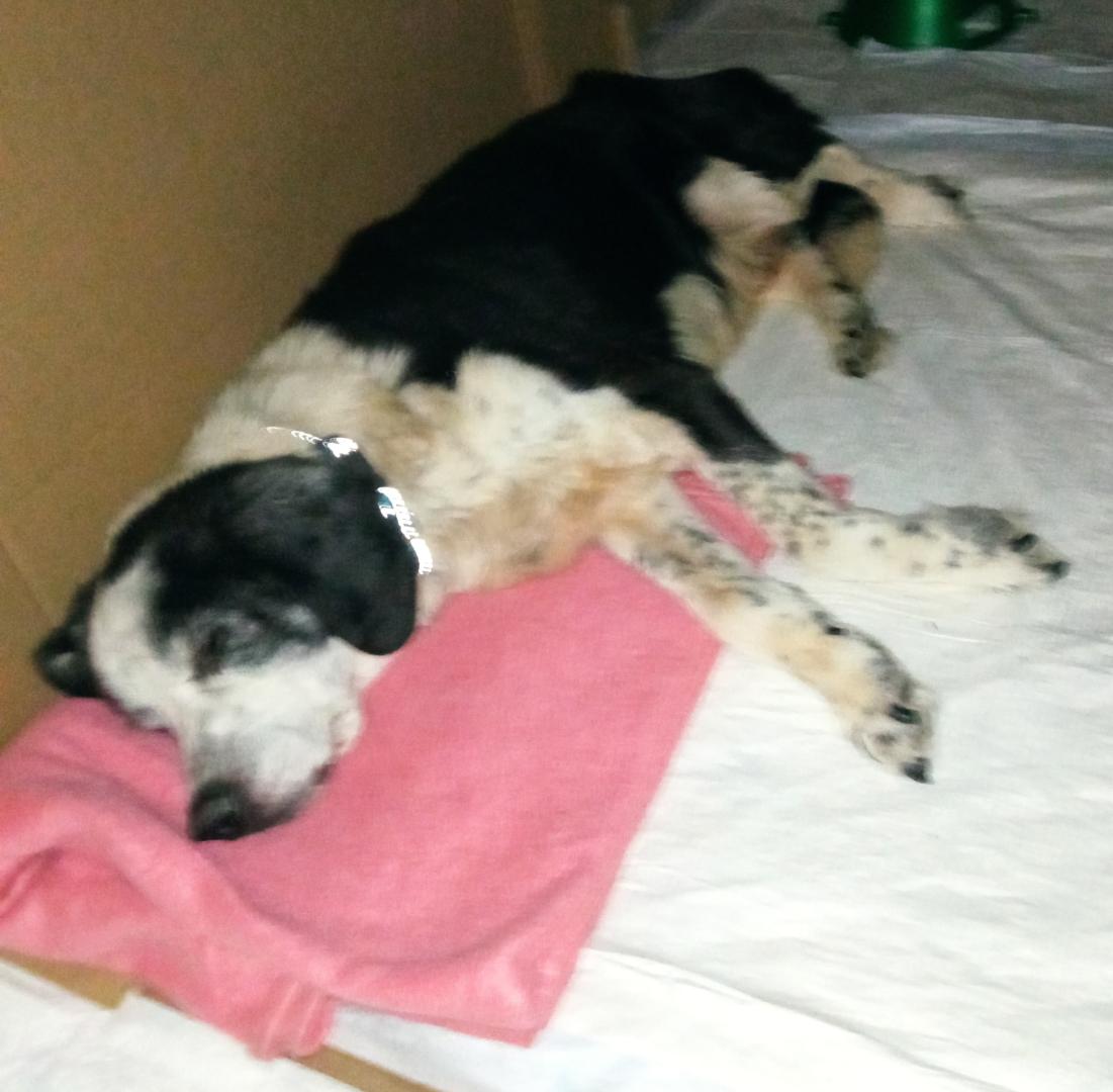 12. Łatuś już u mnie. Dawno mi nie było tak smutno na widok psiaka :(. Zdjęcia nie oddają jego stanu, jest tak zabiedzony, chudy w tylnej części jak przecinek, tylna łapa nie chodzi, są zaniki mięśni, oczka zaropiałe, jak sikał to mocz taki dziwny, drapie się, sierść bardzo brzydka, zapach wiadomo. Leży teraz w przedpokoju, zostawiłam go niech sobie odpocznie spokojnie, miał dzisiaj wrażeń. Jak Asia przyjechała - wreszcie miałam poznać tę wspaniałą osobę , byliśmy z moim Guciem na przywitanie, psiaki się zobaczyły, Gucio był zaciekawiony - tyle psiaków w aucie w tym dziewczyna. Łatuś spokojny, powolutku dreptał, nogi go słabo niosły ale był zainteresowany otoczeniem, zapachami, kilka raxzy podsikał, obok klatki zaraz mam trawę, teraz to bardziej liście, klapł sobie na nie, wniosłam go po schodach, przywitała go Tofinka, jak tylko wszedł do mieszkania to wypił całą miskę wody. Zjadł ładnie kilka kawałków z ręki, położył się, odpoczywa, do psiaków zaciekawiony. Zostawiłam go, niech się oswoi, chociaż on wygląda na domowego. Bardzo jest biedny :(, żal mi go, mam nadzieje że uda mu się poprawić komfort życia.