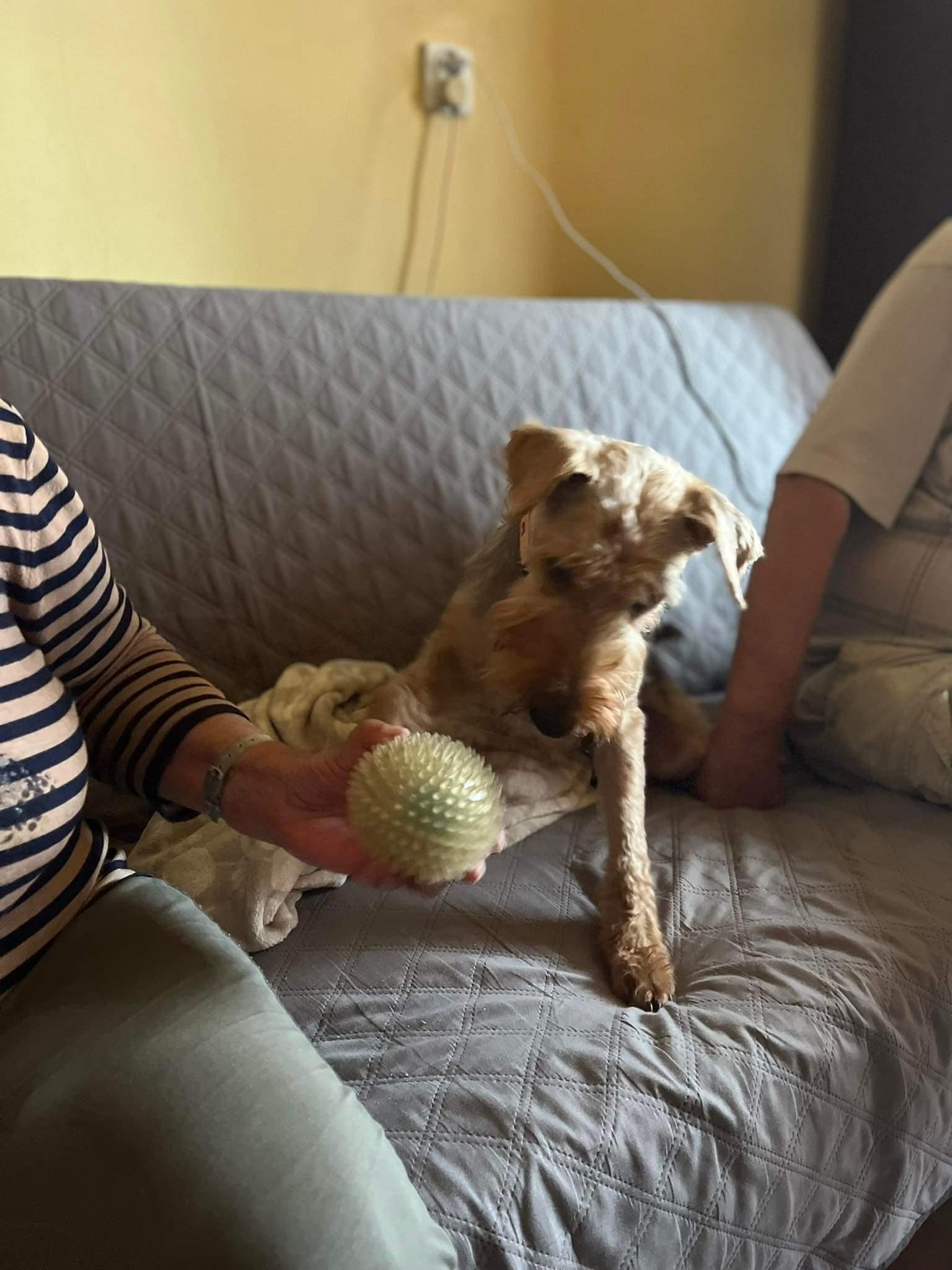 Zojeczka okazała się wielkim pieszczochem, wywala się kołami do góry i tylko mnie głaskaj . Państwo zakochani w niej Pierwszą noc miała troszkę niespokojną, nie mogła sobie znaleźć miejsca ale to normalne. Teraz już jest lepiej, dziś też już spokojniejsza w ciągu dnia, oczywiście bardzo ciekawa zapachów miejsc w swoim domku i ogródku no zabawek, np. bierze sobie zabawkę i zakopuje w swój ręcznik :). Natomiast ma problem z utrzymaniem czystości w domu, zdarza jej się zrobić siku i koo, mimo systematycznego wychodzenia na ogródek. Państwo mają nadzieję że jak miną pierwsze dni , Zoja poczuje się u nich pewniej , zobaczy że codziennie jest już to samo, że codziennie ten sam dom, ci sami ludzie wokoło, miną pierwsze wrażenia emocje, to Zojka będzie się załatwiać na polu.