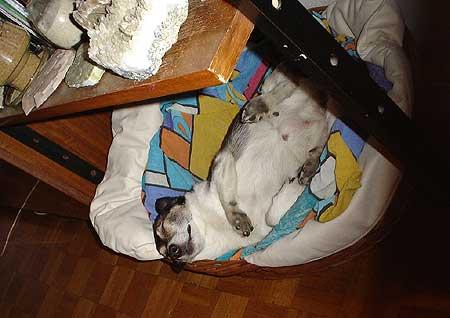 Guzikowym koszykiem to ona się mało interesuje, zdecydowanie woli kanapę. Chociaż akurat teraz śpi właśnie w koszyku. Po pierwszym zachwycie koleżanką Guzik okazał się paskudnym egocentrykiem, nawet odezwać się do suni nie mogę bo natychmiast pcha się pod ręce. A jak próbuję ją głaskać to potrafi ją odepchnąć i wepchnąć się na jej miejsce. Nawet szelek nie mogę jej spokojnie założyć bo Guzik natychmiast pcha łepek pod moje ręce i każe się głaskać. Okropny zazdrośnik z niego. Ale poza tym to nie jest źle, bawi się z nią, spali sobie w nocy przytuleni razem (na moim tapczanie oczywiście), żeby mnie nie było to byliby idealnie zaprzyjaźnieni :)