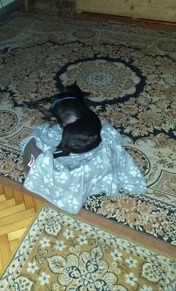 U Grzesia wszystko dobrze, już się otworzył, macha ogonkiem jak widzi panie, na spacerki po ogrodzie chodzi także sam, ale niechętnie bo woli być przy domu, lubi się też opalać na tarasie, cały czas przebywając przy pani. Lubi jak się go czochra po grzbiecie i mocno chrapie! -