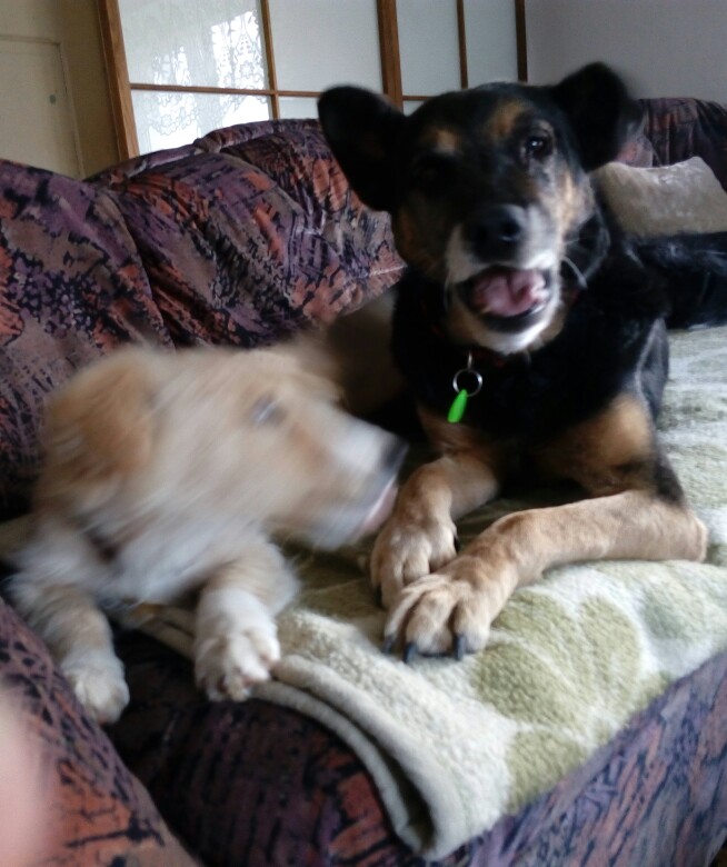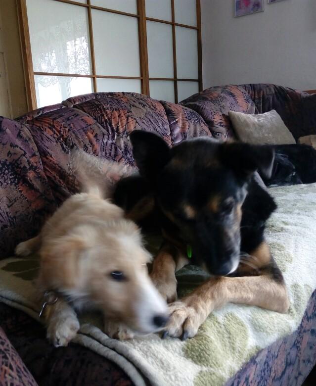 Gapulek chyba już zapomniał o małej kumpelce, wszystko u niego ok... tylko tak trochę nudniej ... nikt nie ciągnie za obrożę, szczeniorka czasem nawet ciągnęła Gapcia za skórkę na szyjce, a on taki był dla niej łagodny i miły e znosił to bez mruknięcia i pozwalał małej wyczyniać na całego :) (mimo że do kolegów dorosłych samców jak mu coś nie pasuje potrafi zdrowo pokazać ząbki) niebywała była ta przyjaźń, żaden inny psiak nie był aż taki opiekuńczy i miły dla szczeniorki ostatnie wspolne fotki :( -